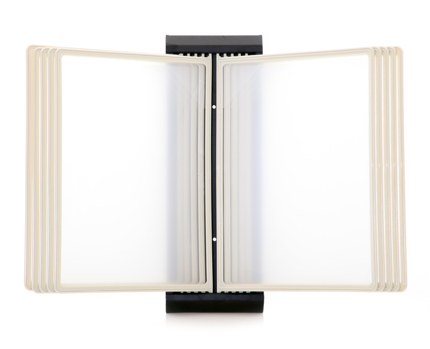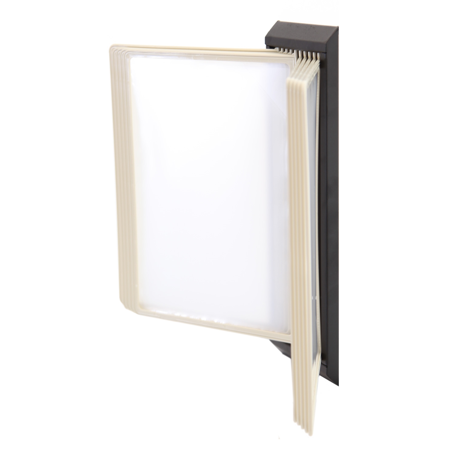 Svartlakkert stål registersystem til montering på veggen, som leveres med 10stk. dobbelsidige A4 lommer i biege.