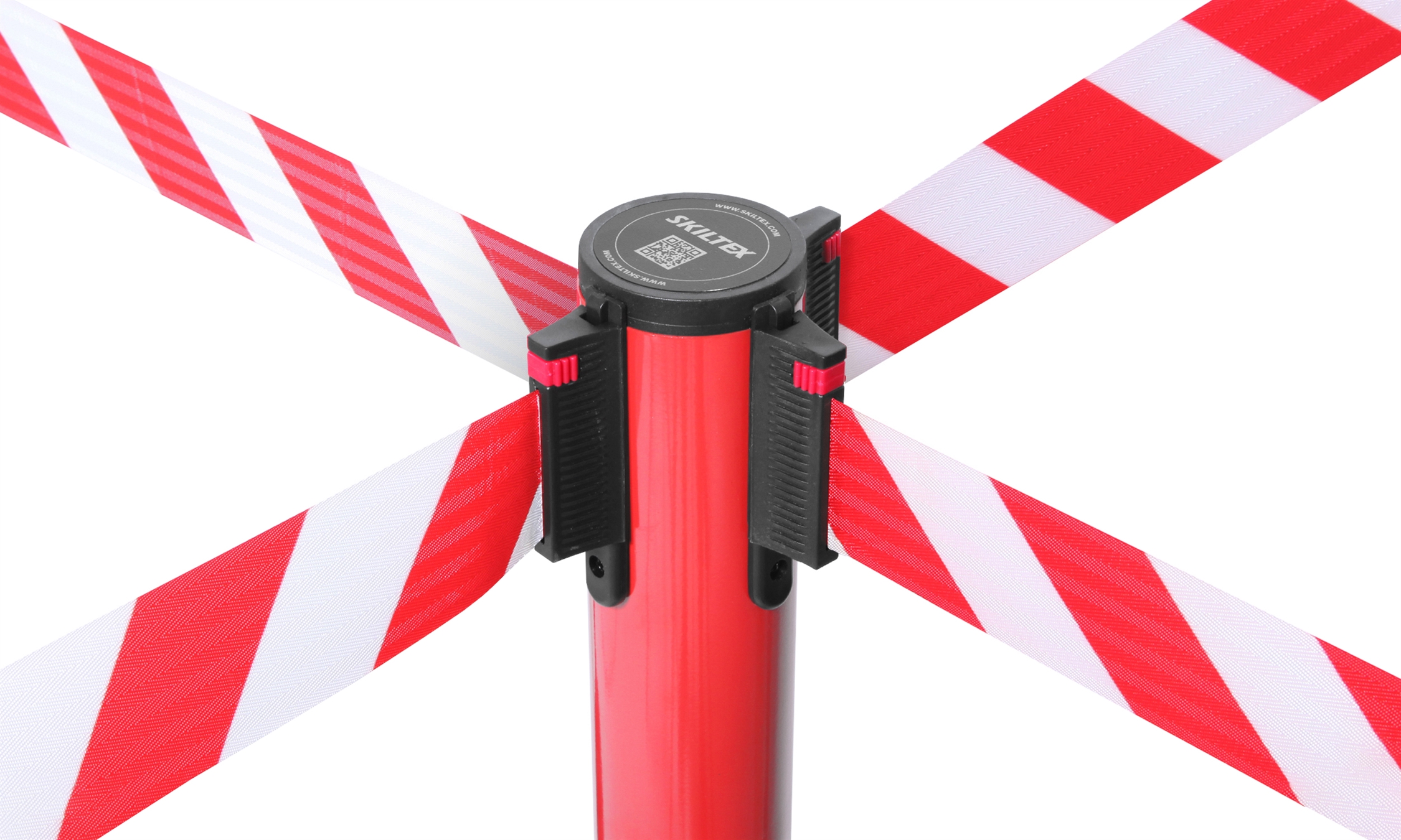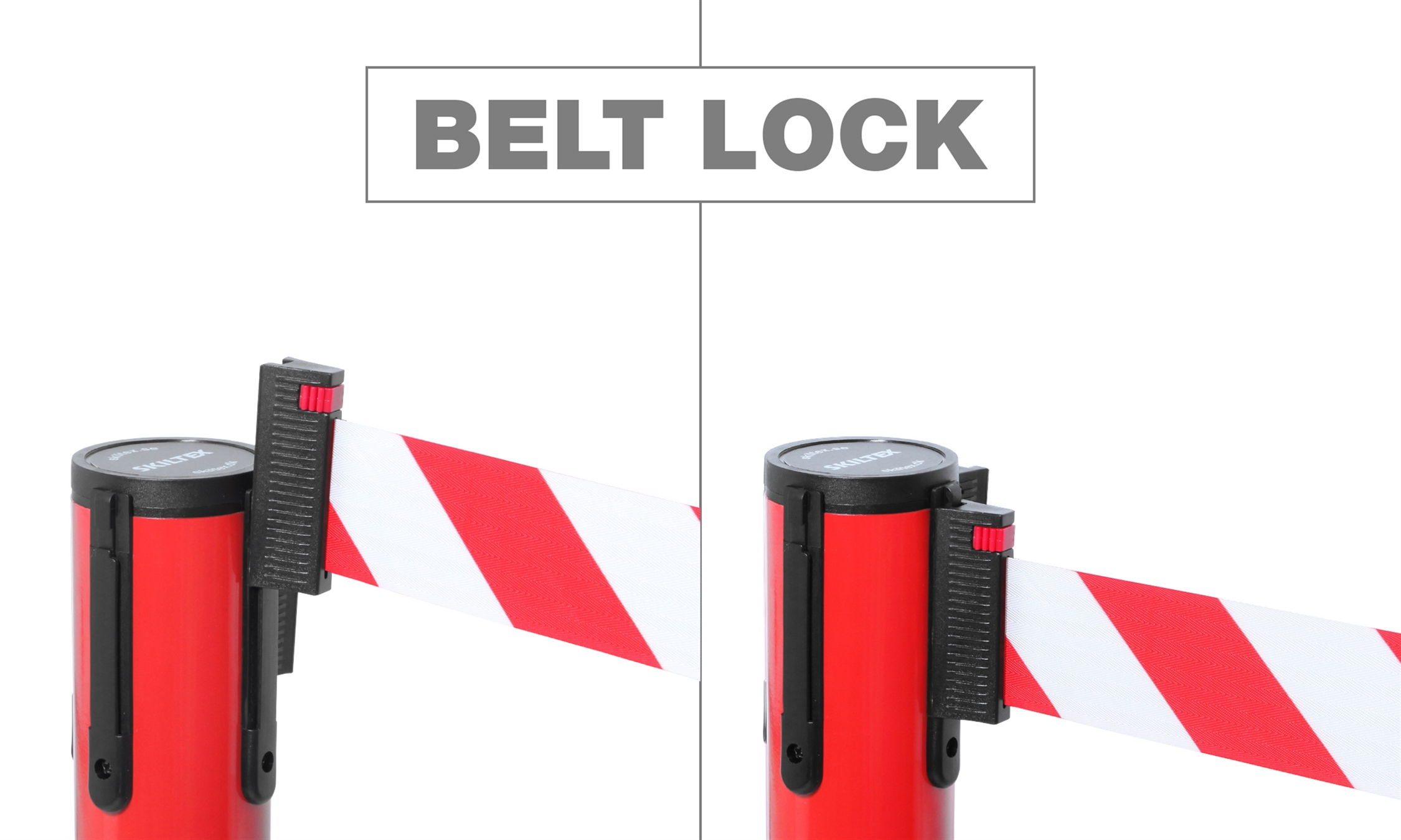 Bånden er utstyrt med en lås, som sikrer, at de sitter godt og fast på andre stolper. Skiltex avsperringsstolper har en universell bånd-lås, som passer til andre populære avsperringstolpe-brands – med garanti.