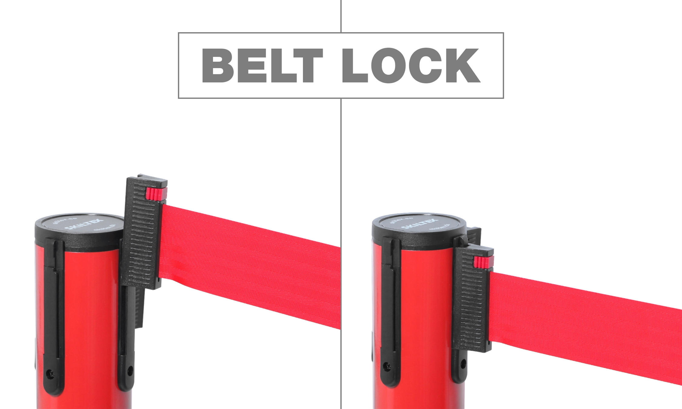 Bånden er utstyrt med en lås, som sikrer, at de sitter godt og fast på andre stolper. Skiltex avsperringsstolper har en universell bånd-lås, som passer til andre populære avsperringstolpe-brands – med garanti.