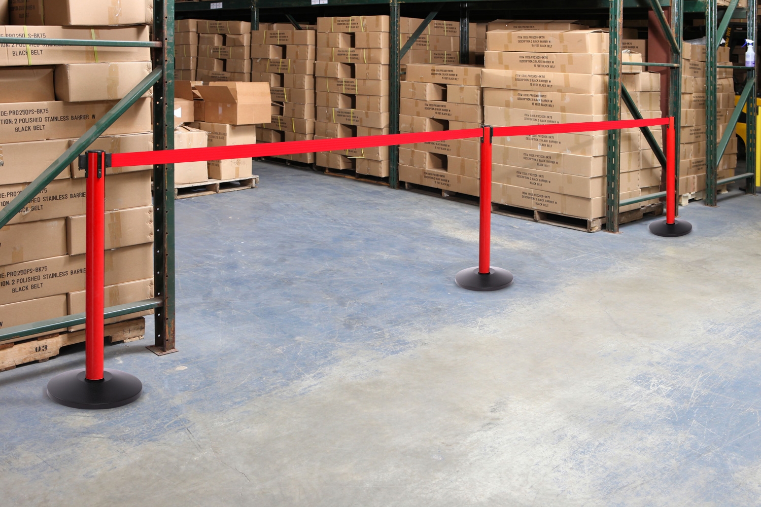 Røde SafetyMaster avsperringsstolper er produsert i galvanisert stål med en tung og stabil betongfyllt fot med gulv beskyttelse.
