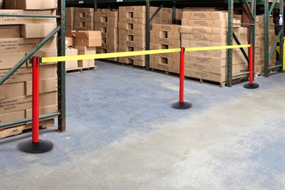 Røde SafetyMaster avsperringsstolper er produsert i galvanisert stål med en tung og stabil betongfyllt fot med gulv beskyttelse.