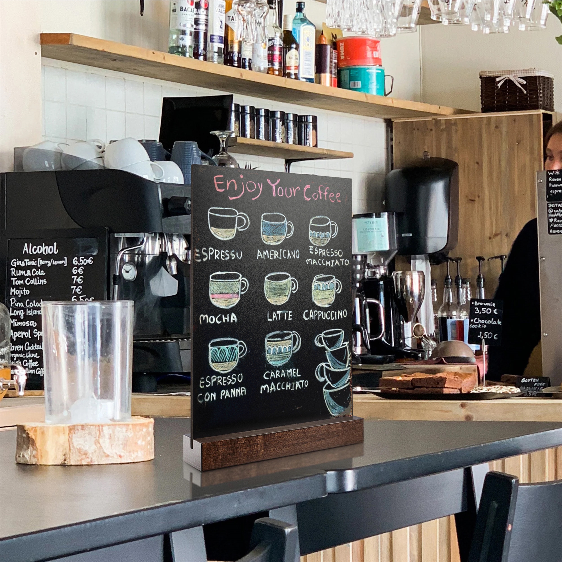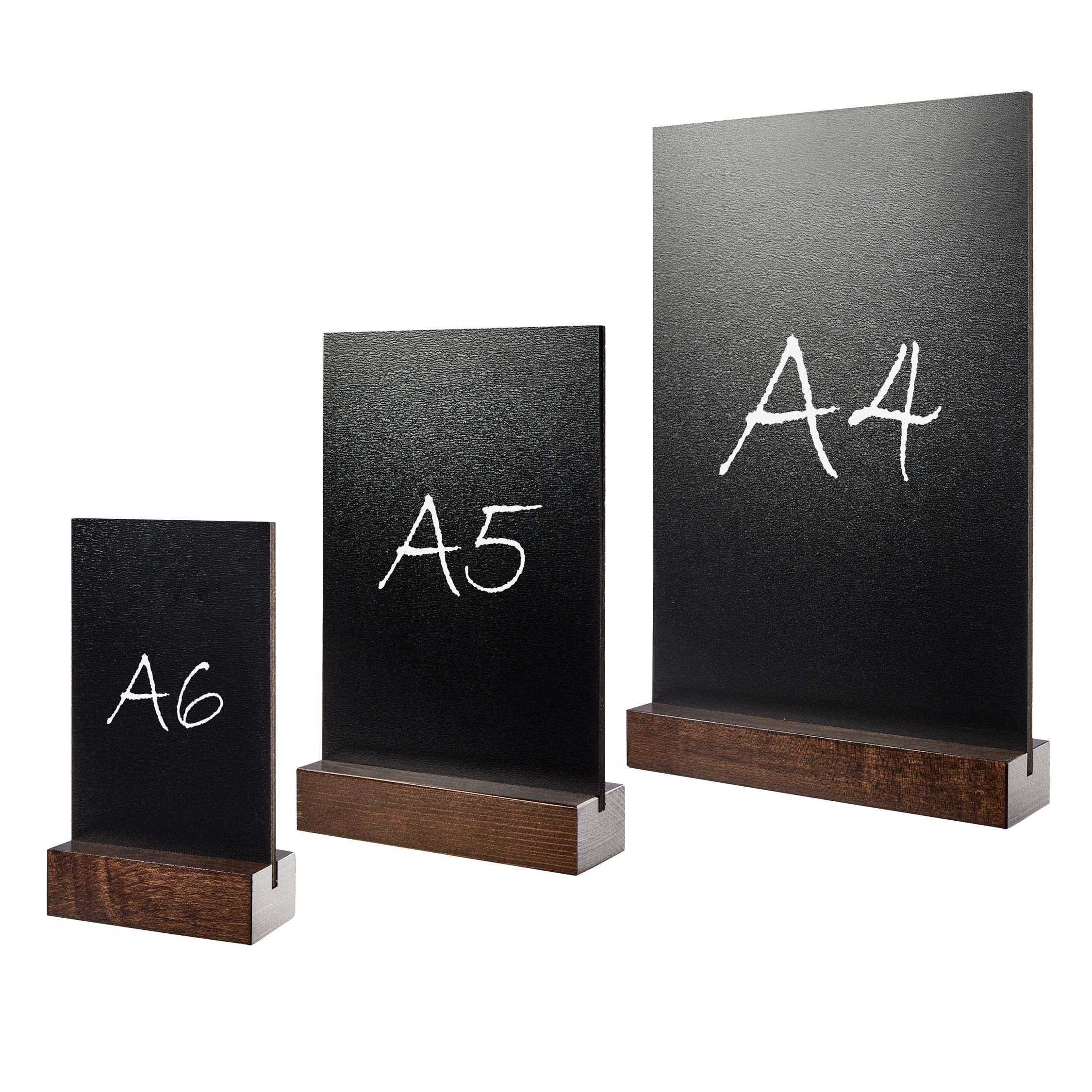 Med praktiske størrelser i A6, A5 og A4 gjør tavlene det enkelt å oppdatere innholdet raskt. Den mørkebrune trefoten gir et stilrent og rustikt preg som passer perfekt til enhver kafé, restaurant eller butikk.