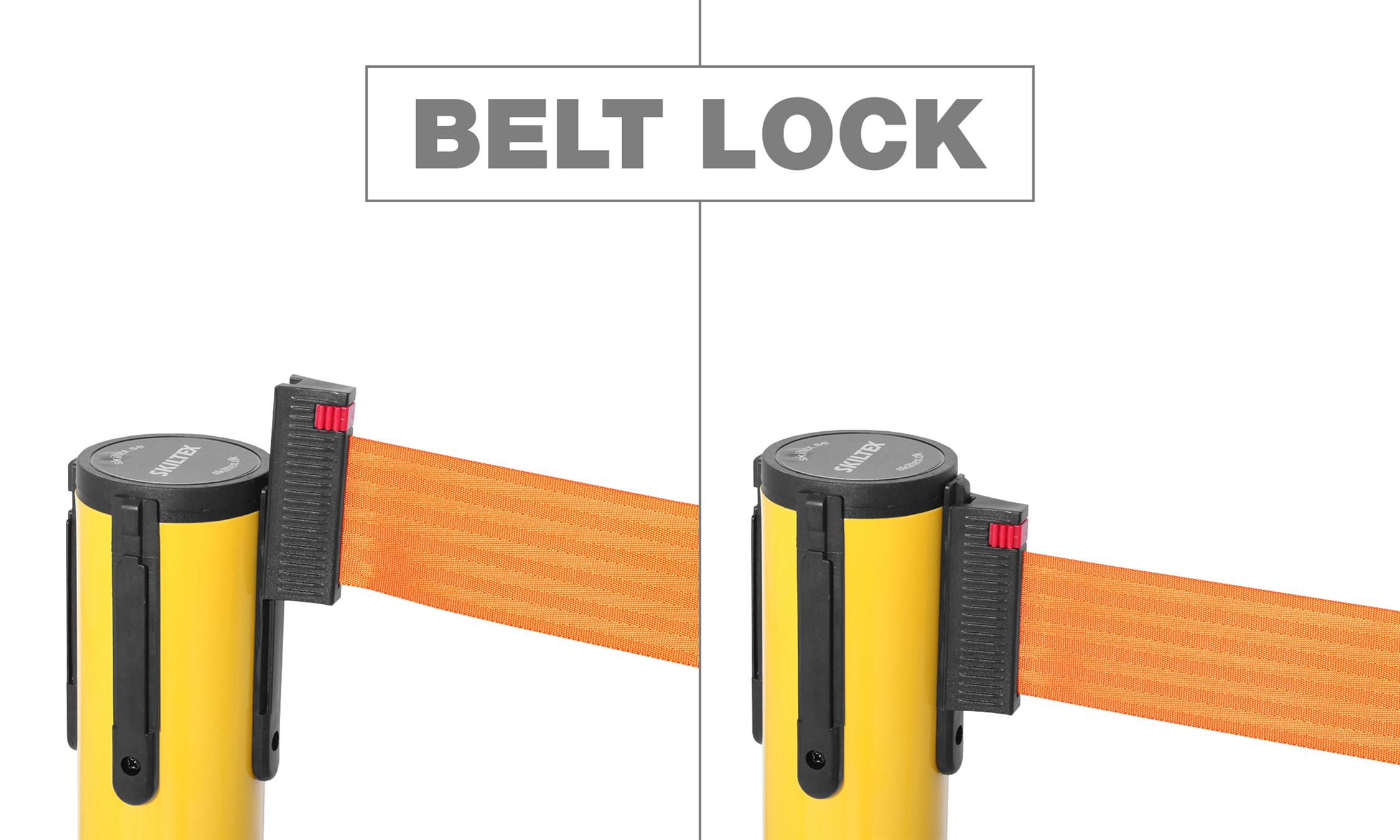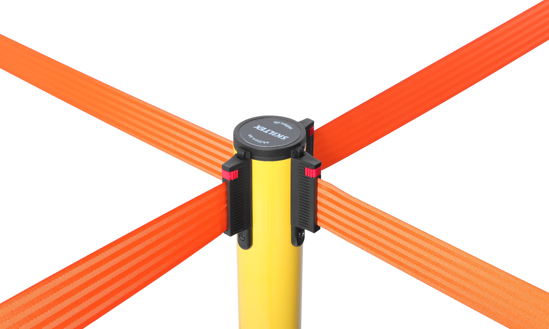 Bånden er utstyrt med en lås, som sikrer, at de sitter godt og fast på andre stolper. Skiltex avsperringsstolper har en universell bånd-lås, som passer til andre populære avsperringstolpe-brands – med garanti.