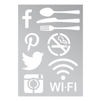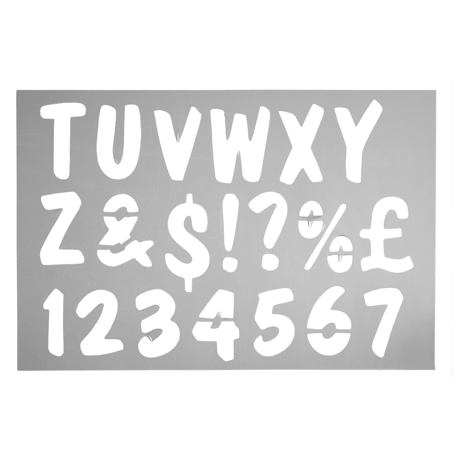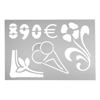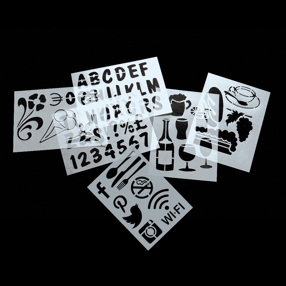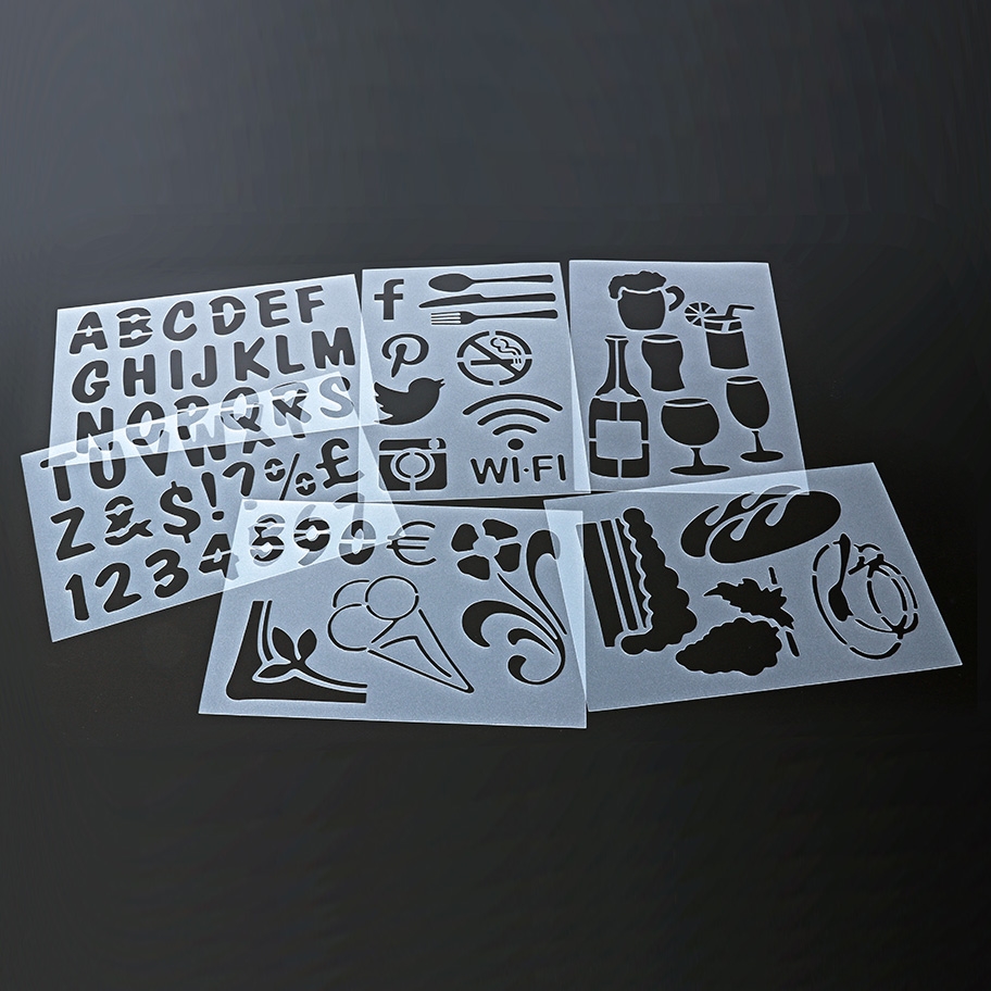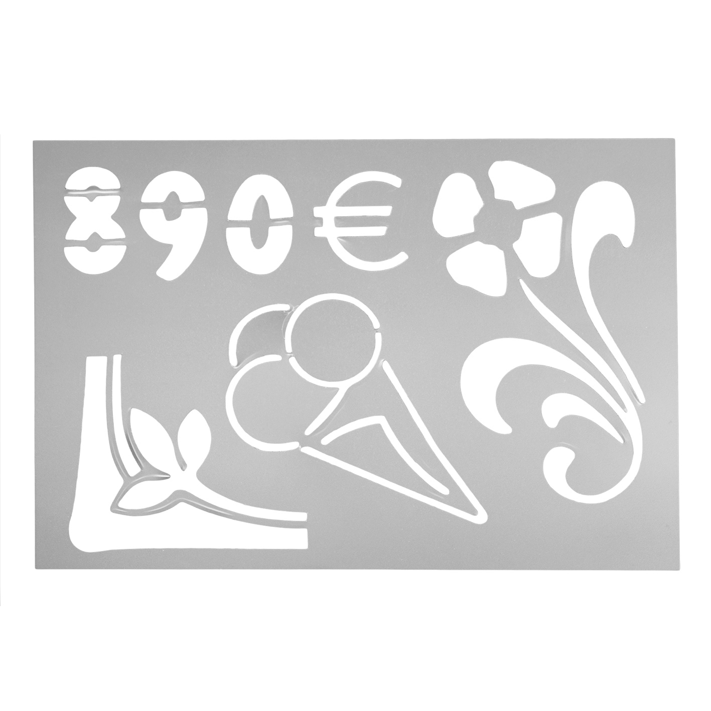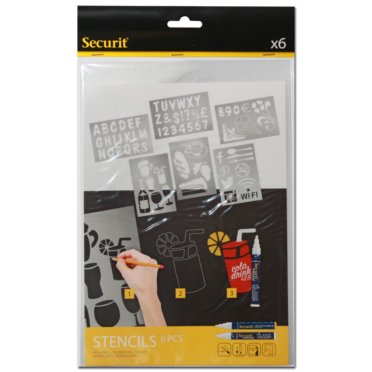 Securit sjablongsett som inneholder seks A4 maler med 20 forskjellige design samt bokstaver og tall.