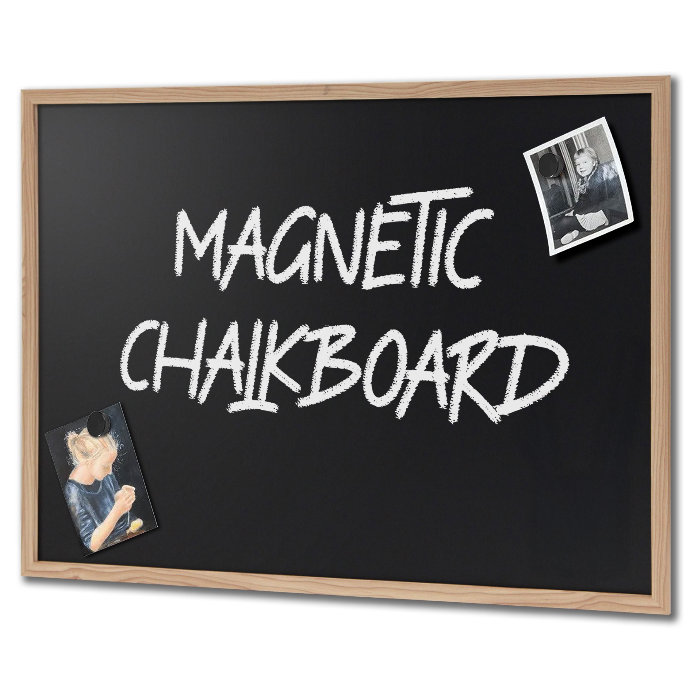 Stilig og solid krittavle med vakker svart magnetisk bakplate omkranset av en elegant 2 cm trelist.