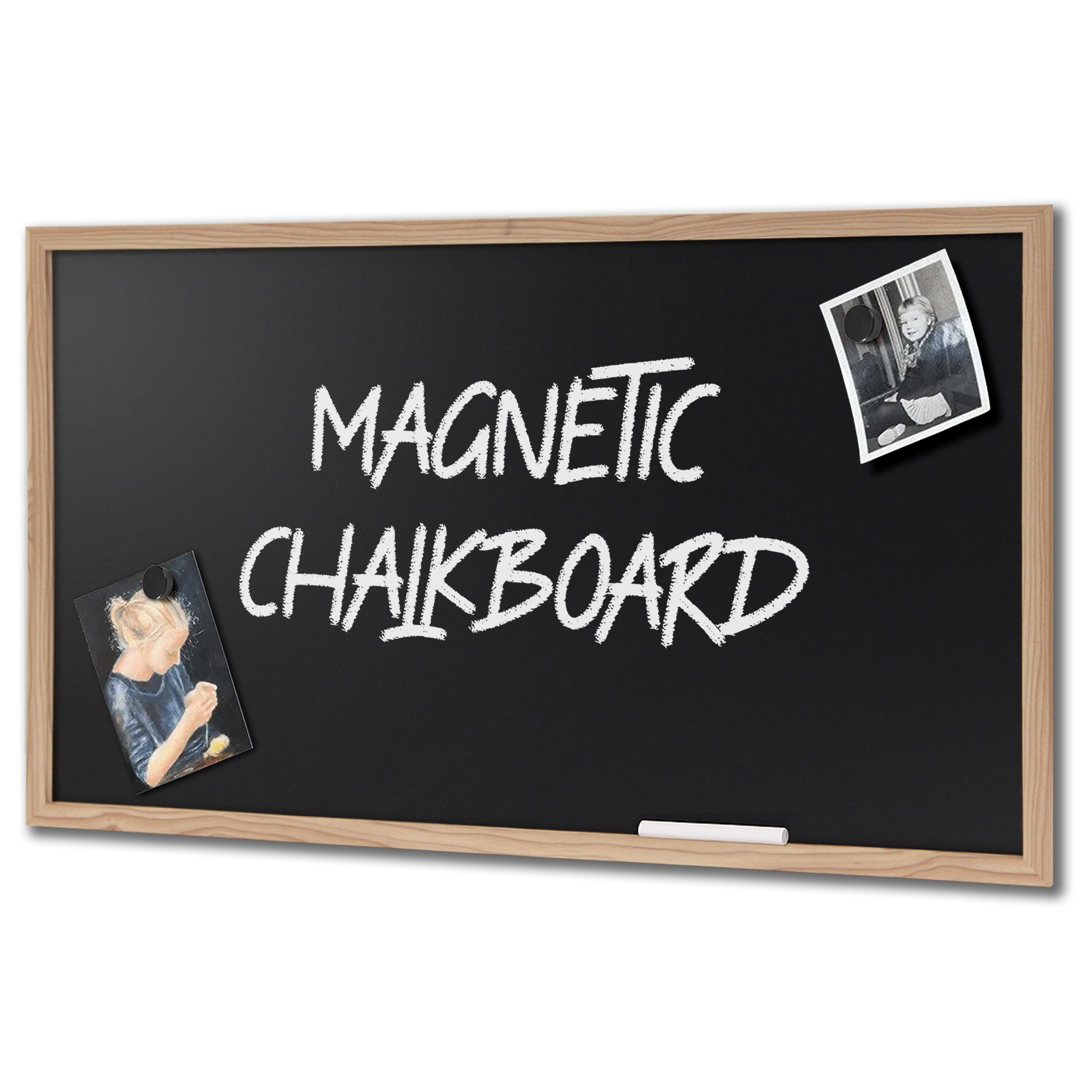 Stilig og solid krittavle med vakker svart magnetisk bakplate omkranset av en elegant 2 cm trelist.
