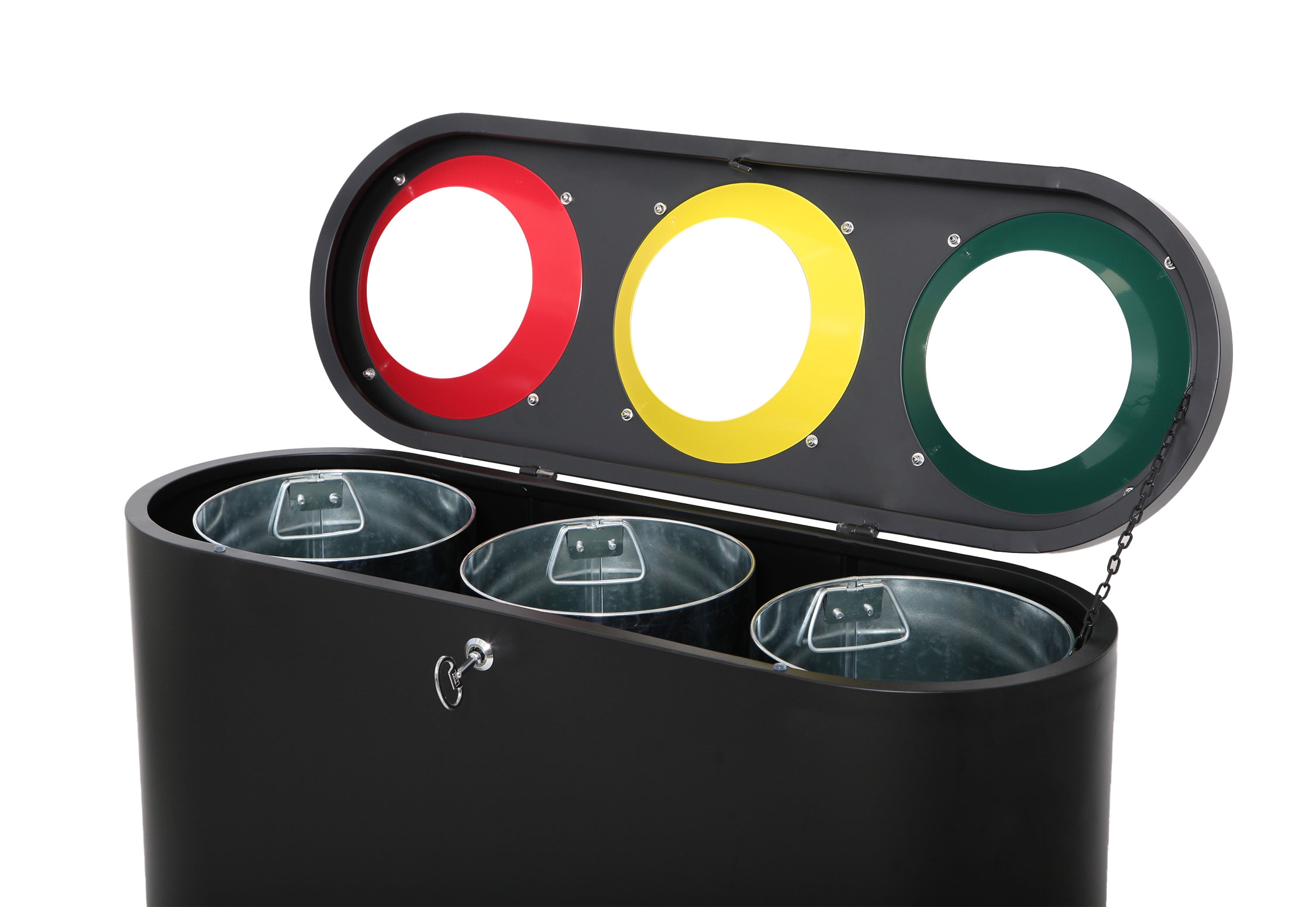 Beholderen er utstyrt med tre 39 liters interne beholdere i galvanisert stål, som hver kan tildeles en spesifikk type avfall. Hver beholder har en passende kapasitet i liter for å imøtekomme daglige behov og gjøre dem enkle å tømme.En nøkkel følger med for å sikre sikker åpning og lukking av beholderen, noe som hindrer uønsket tilgang og opprettholder hygiene.