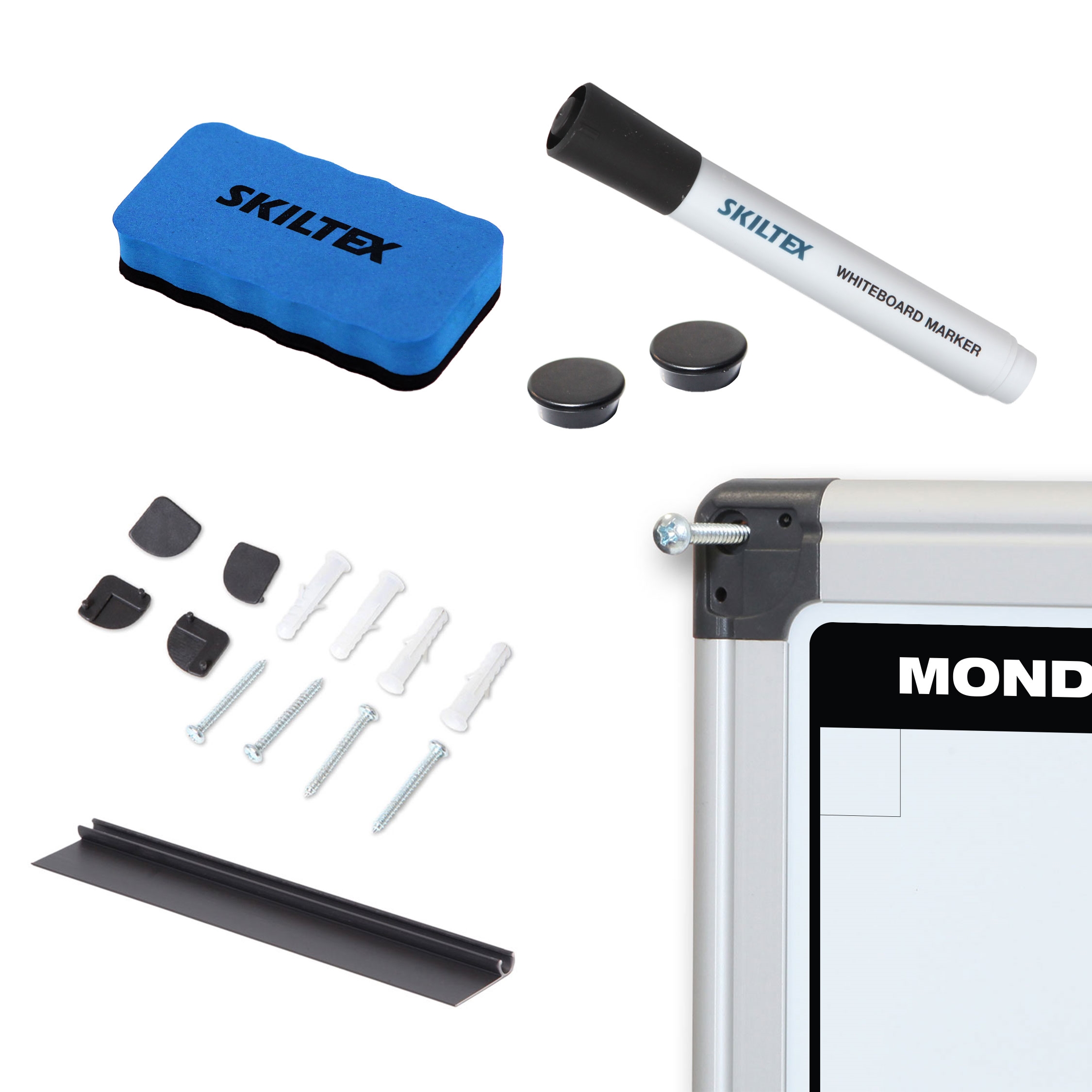 Klar til bruk – alt nødvendig tilbehør medfølger: 2 magneter, 1 svart whiteboard-tusj, pennehylle, skruer og plugger for veggmontering.