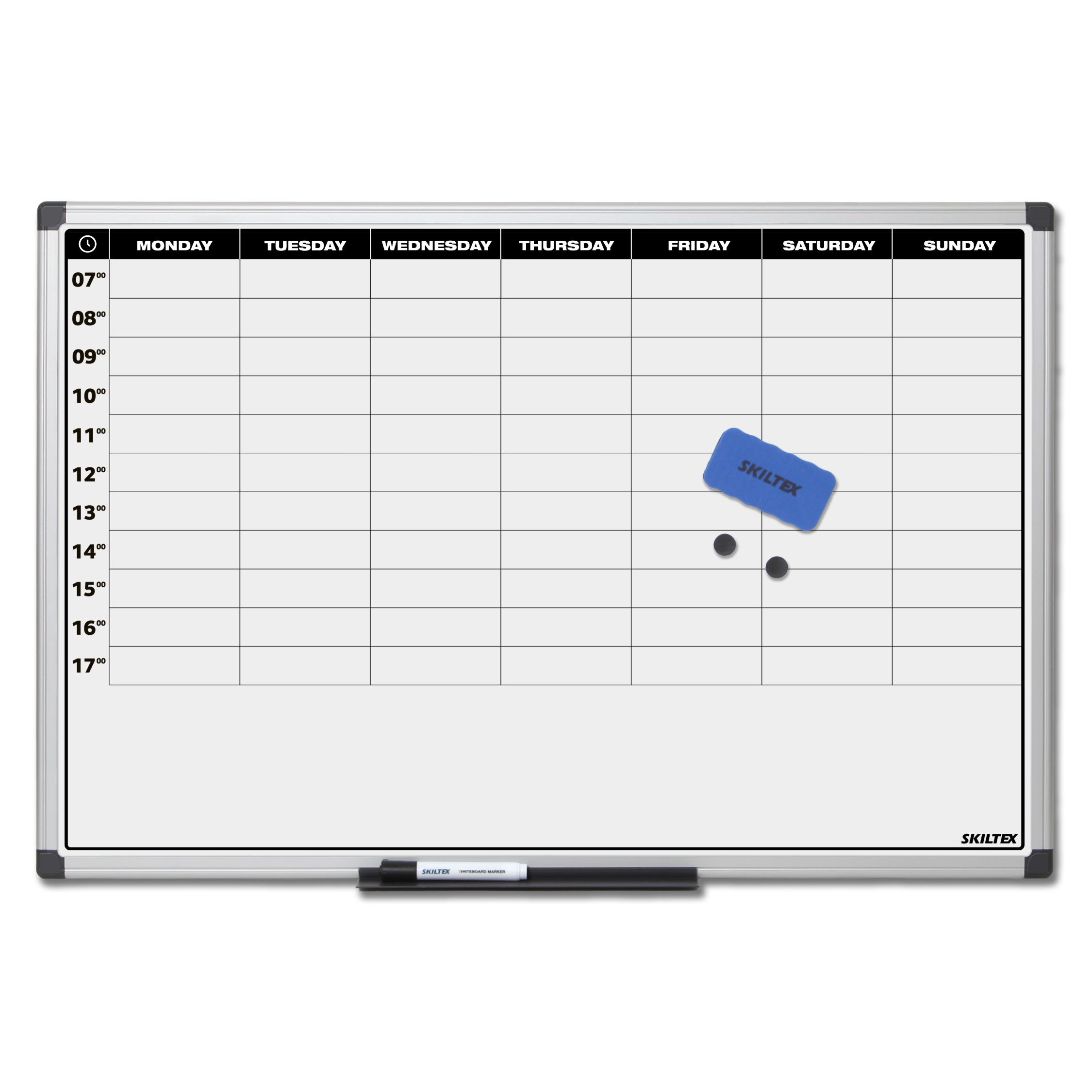 Planlegg uken din effektivt med denne stilrene og slitesterke planleggingstavlen fra SKILTEX. Tavlen måler 90x60 cm og har en tydelig ukesoversikt med tidsinndeling fra kl. 07:00 til 17:00 - ideell for møter, oppgaver, undervisning og aktiviteter.