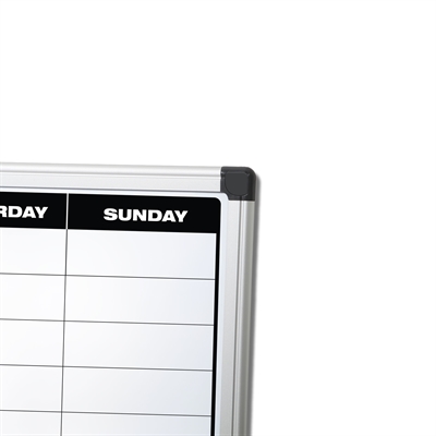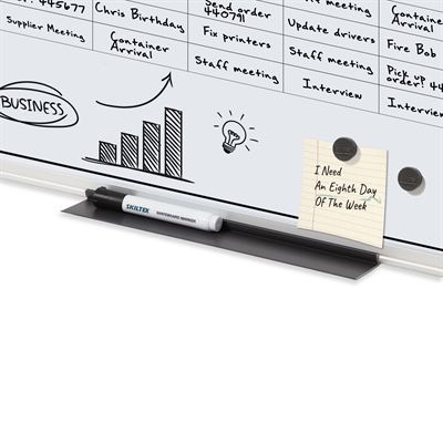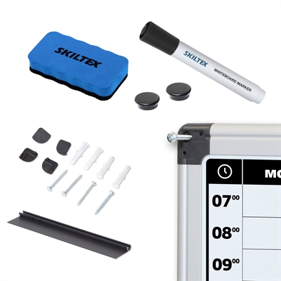 Med medfølgende whiteboard-tusj, tavlesvamp, magneter og monteringssett er du klar til bruk umiddelbart. Aluminiumsrammen med hjørnebeskyttere gir et moderne og robust uttrykk - en funksjonell løsning for alle som ønsker en rask visuell oversikt over ukens planer.