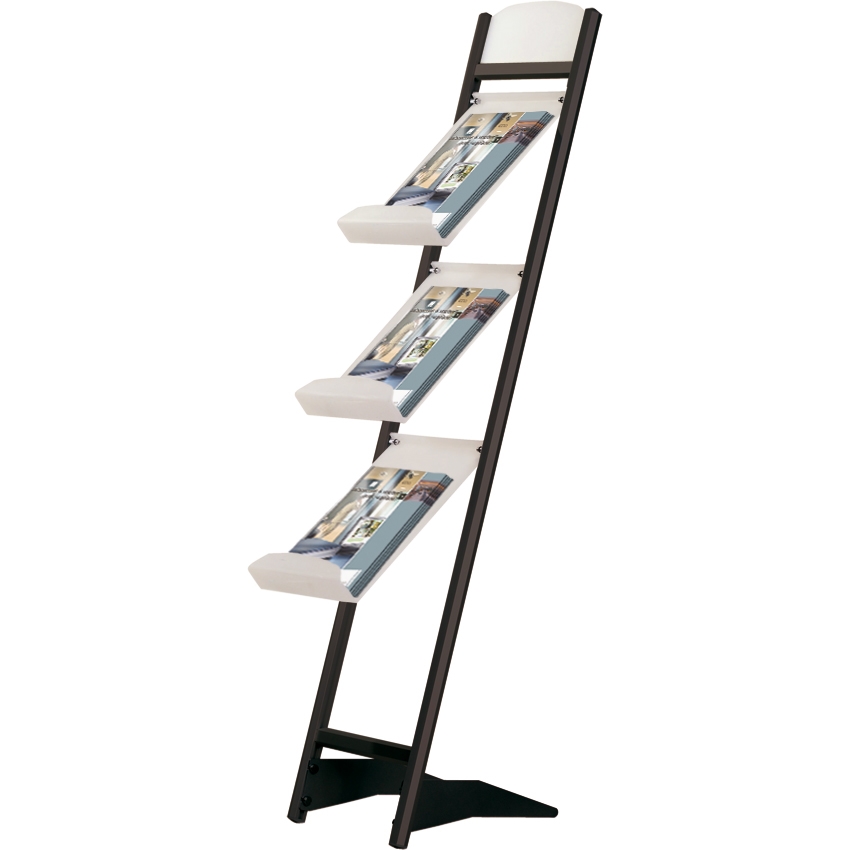 Svart pulverlakkert Alu brosjyrestativ. Brosjyre hyllene (3xA4) er laget i 4mm frostet akryl. Der kan bli satt in budskap imellom de 2 logo platerne eller monteres logoprint på. Pakket i flat eske, kjapp og enkel at trekke sammen.