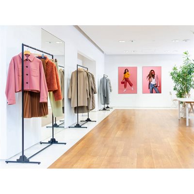 Produkten leveres med en stoffplakat som er avsluttet med en silikonestrimmelkant sydd på rundt om kantene, hvilket gjør det enkelt for dig at sette inn grafikken i ekstruderingene i rammens kanter. Grafikken kan skiftes enkelt og raskt uten bruk av verktøy. Produkten leveres usamlet.