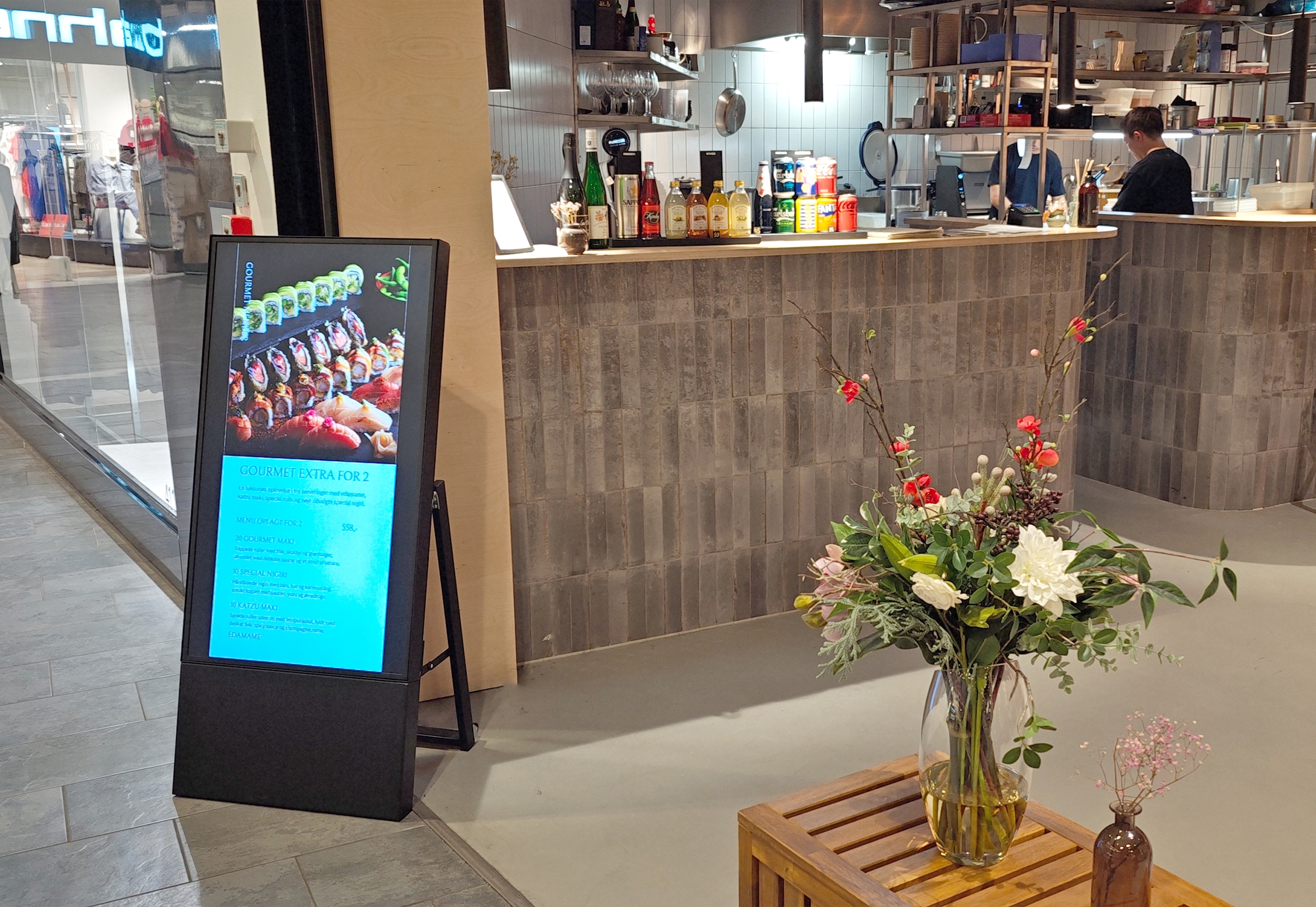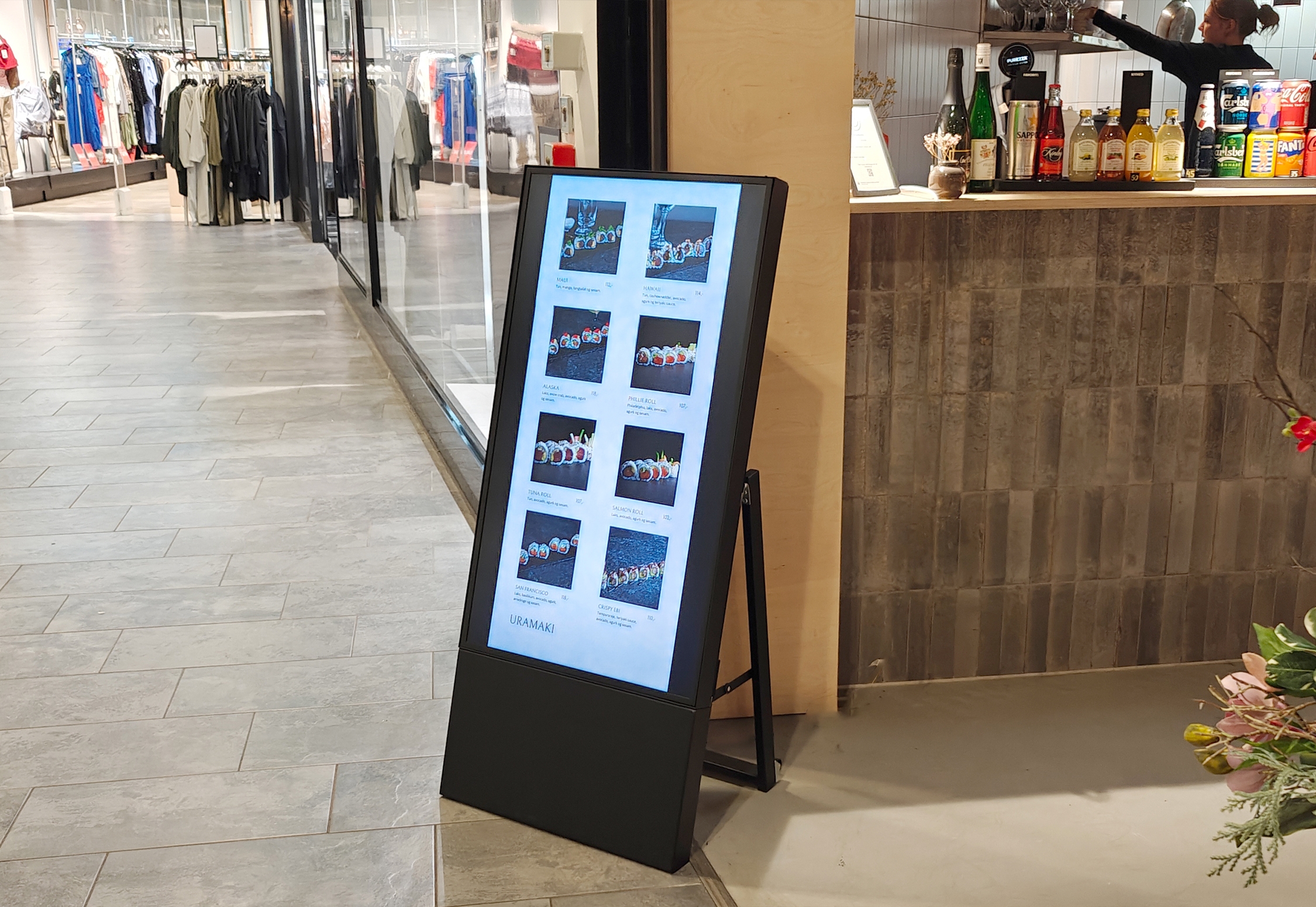 Elegant digitalt gatebukk laget av stål med en tynn, rammeløs design og ekstra stabil fot. A-skiltet er enkelt å transportere takket være den sammenleggbare foten.