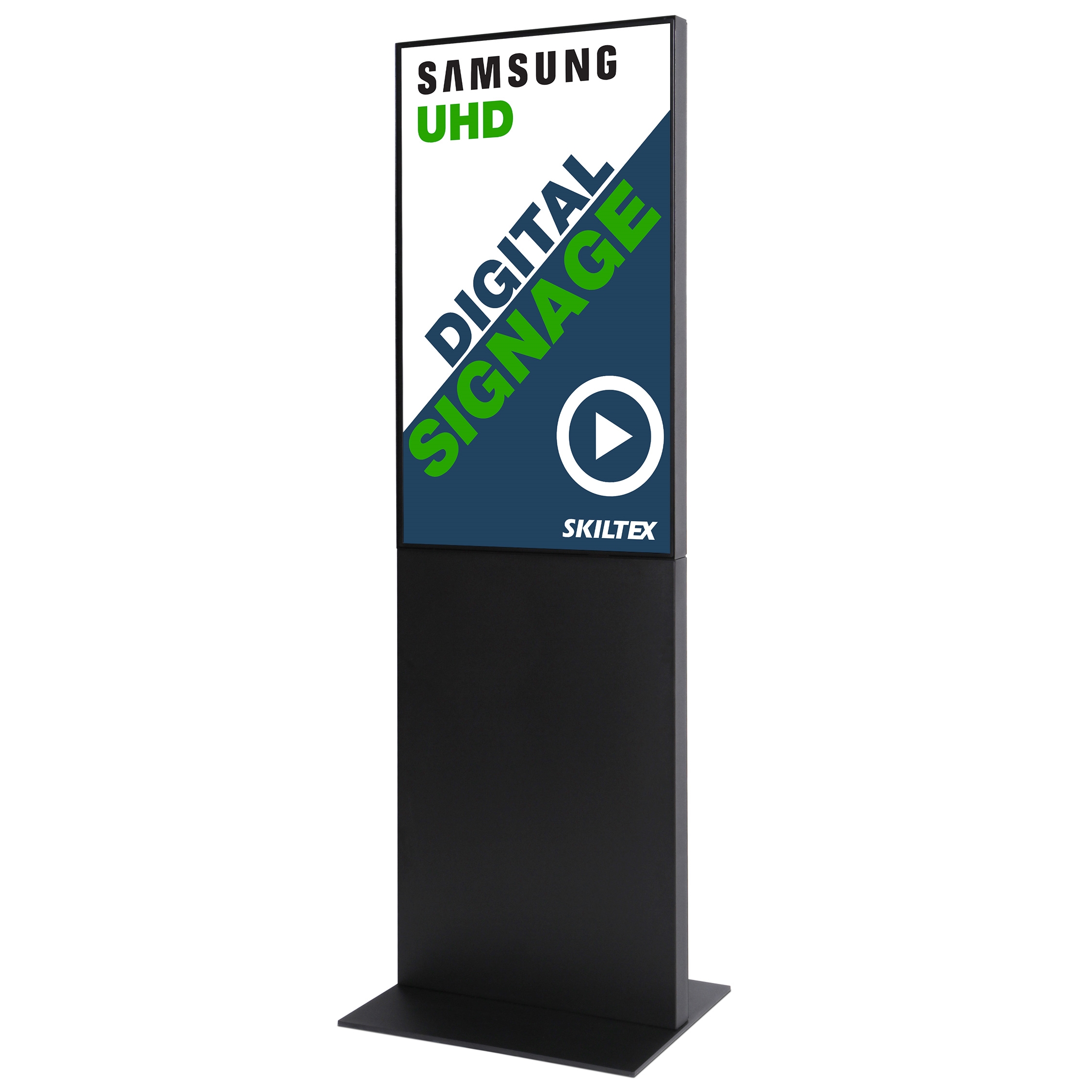 Stilig digital totem i stål med toppmoderne, rammeløs design, som leveres klar til bruk med en profesjonell Samsung 4K UHD-skjerm (QMC) og MagicINFO™-spiller.