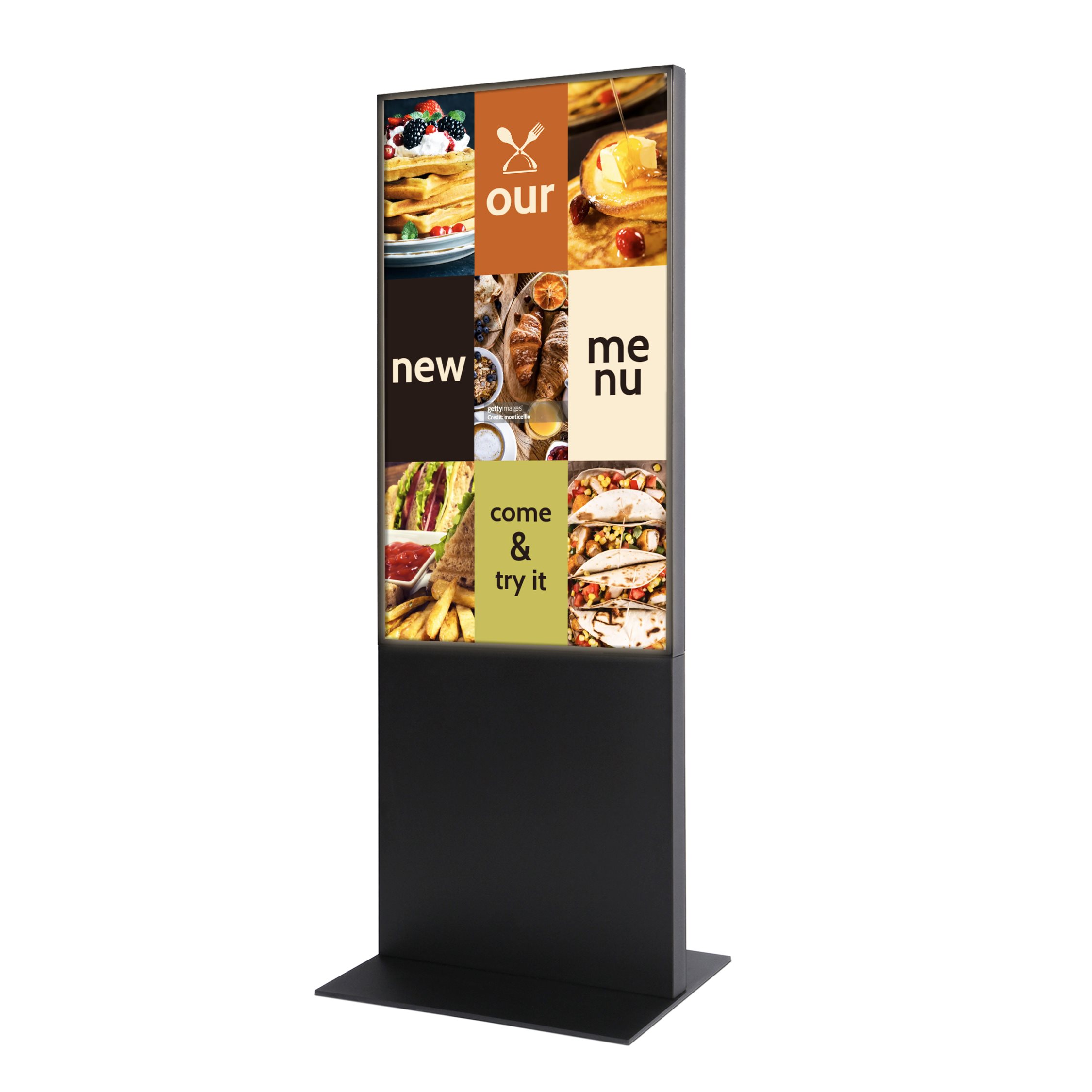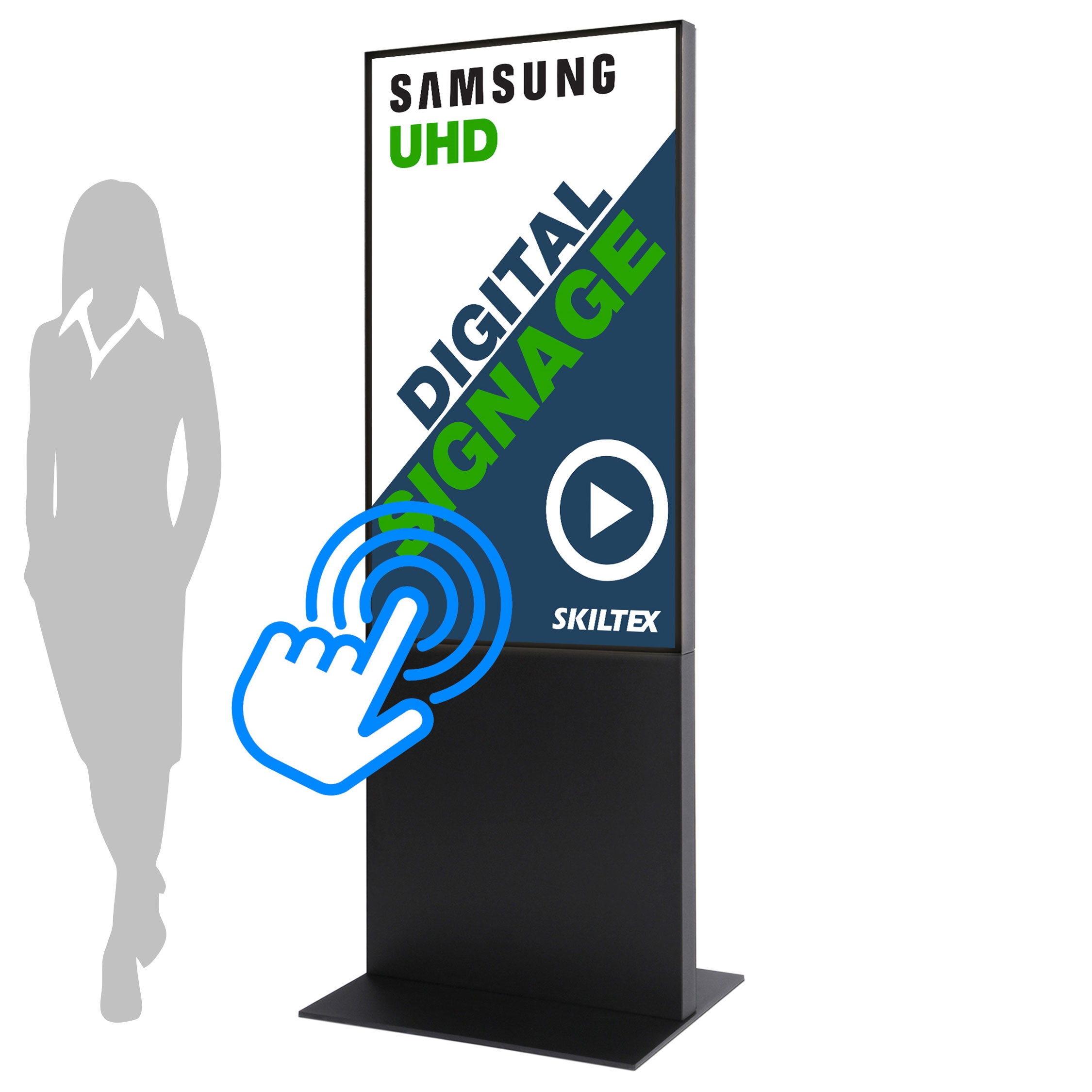 Stilig digital totem i stål med toppmoderne, rammeløs design, som leveres klar til bruk med en profesjonell 55" Samsung 4K UHD-Touch skjerm ( QM55C ) og MagicINFO™-spiller.