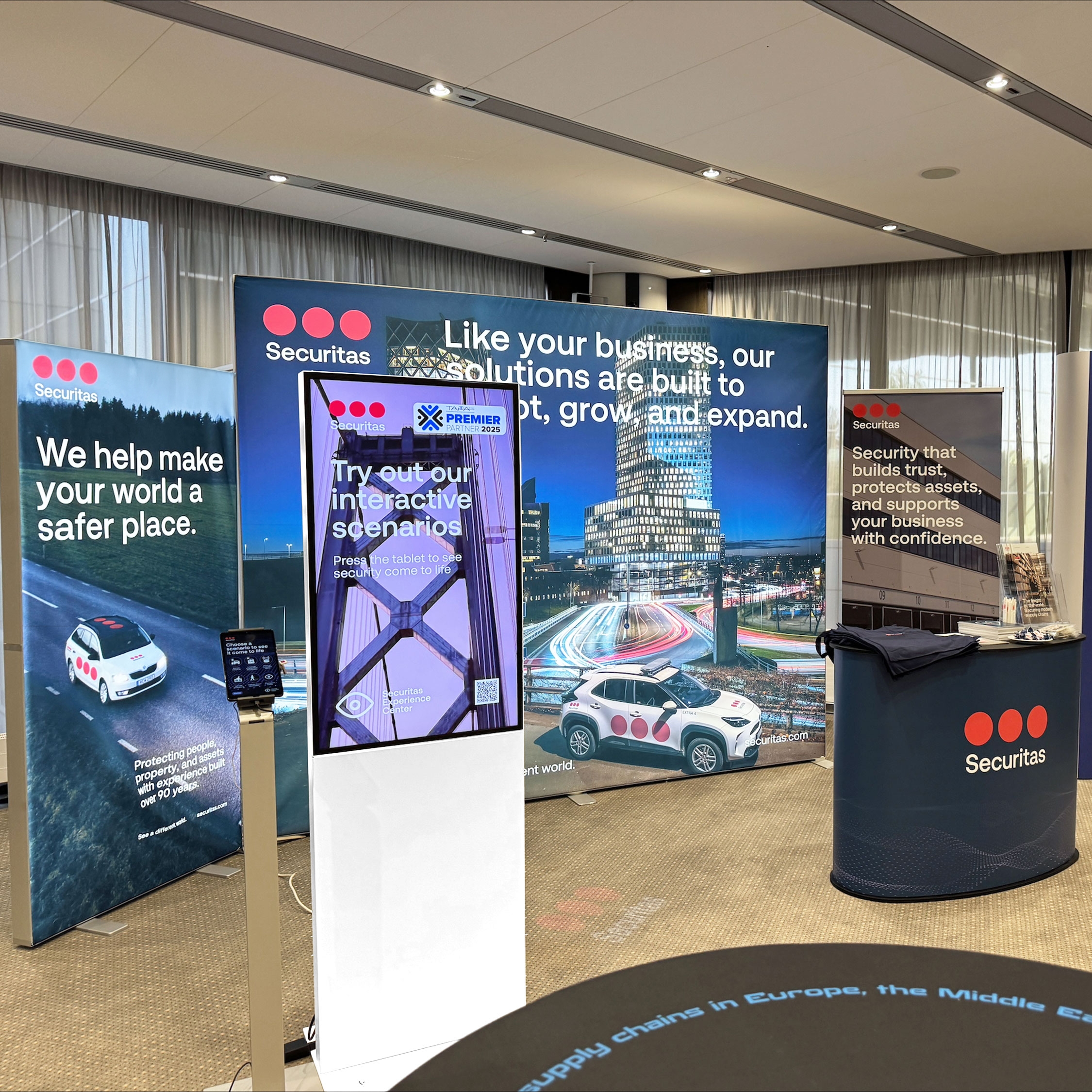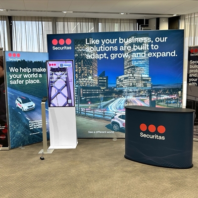 Stilig digital totem i stål med toppmoderne, rammeløs design, som leveres klar til bruk med en profesjonell 43" Samsung 4K UHD touch skjerm ( QM43B-T ) og MagicINFO™-spiller.