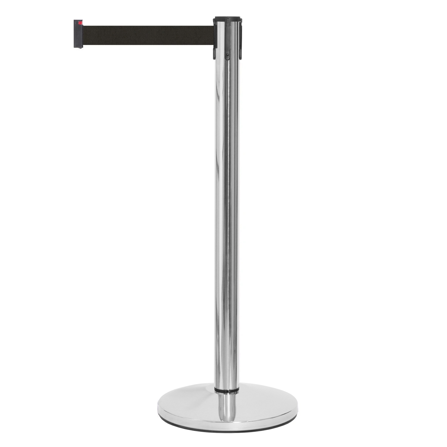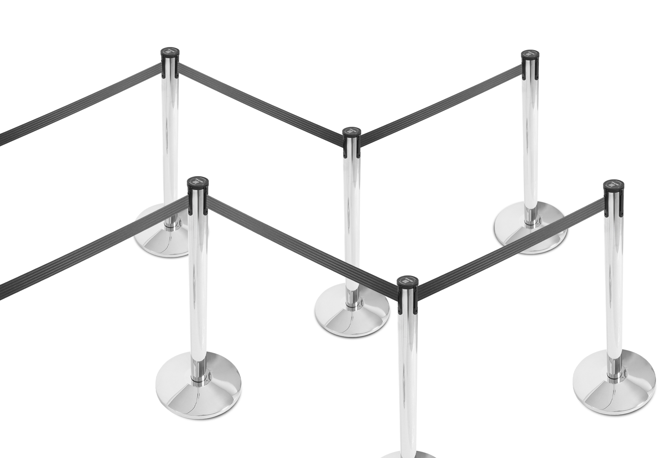 Sølv avsperringsstolper produsert i galvanisert stål med en tung og stabil betongfyllt fot med gulv beskyttelse.