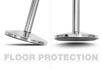 Sølv avsperringsstolper produsert i galvanisert stål med en tung og stabil betongfyllt fot med gulv beskyttelse.
