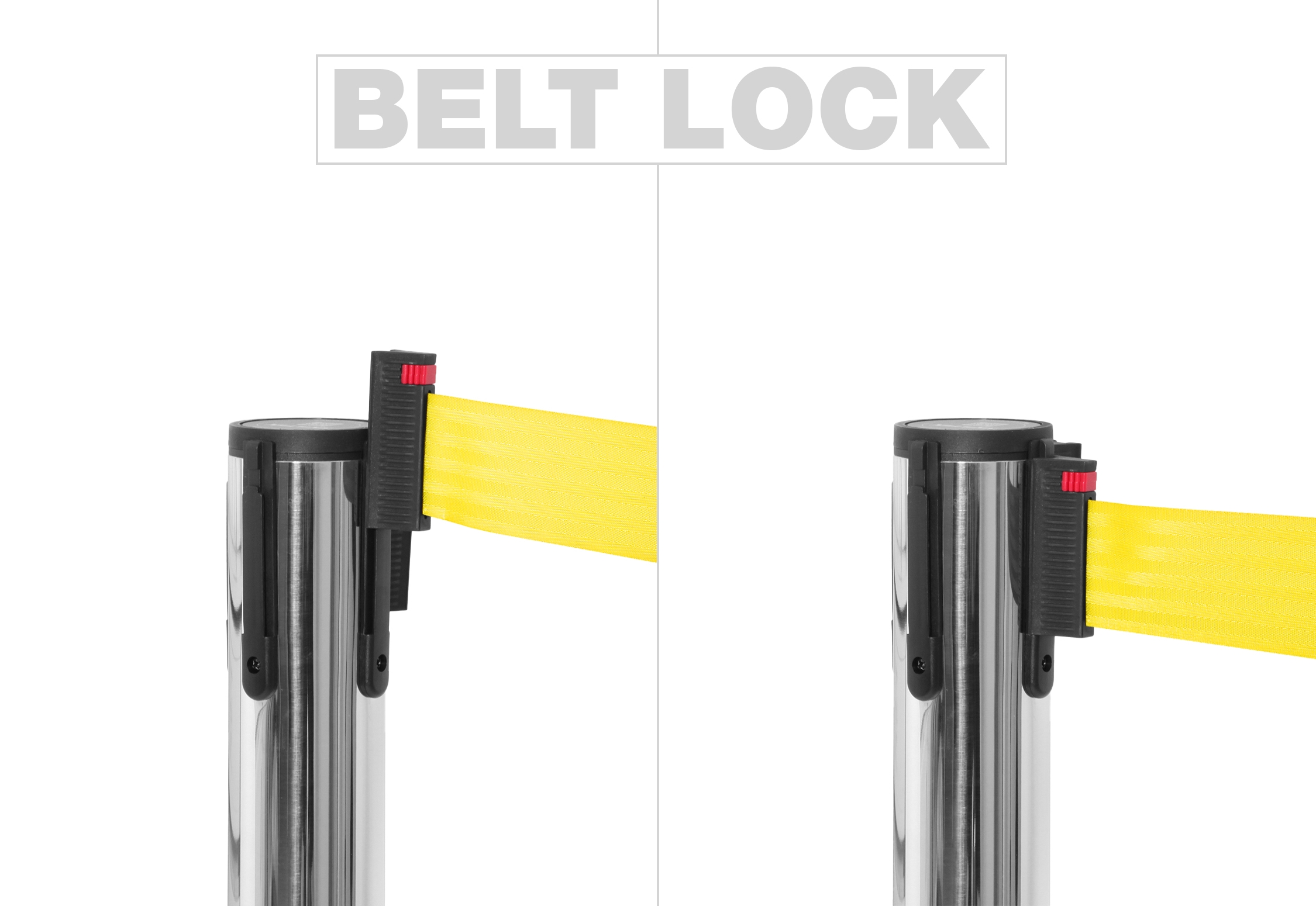 Båndene er utstyrt med en lås, som sikrer, at de sitter godt og fast på andre stolper. Skiltex avsperringsstolper har en universell bånd-lås, som passer til andre populære avsperringstolpe-brands – med garanti.