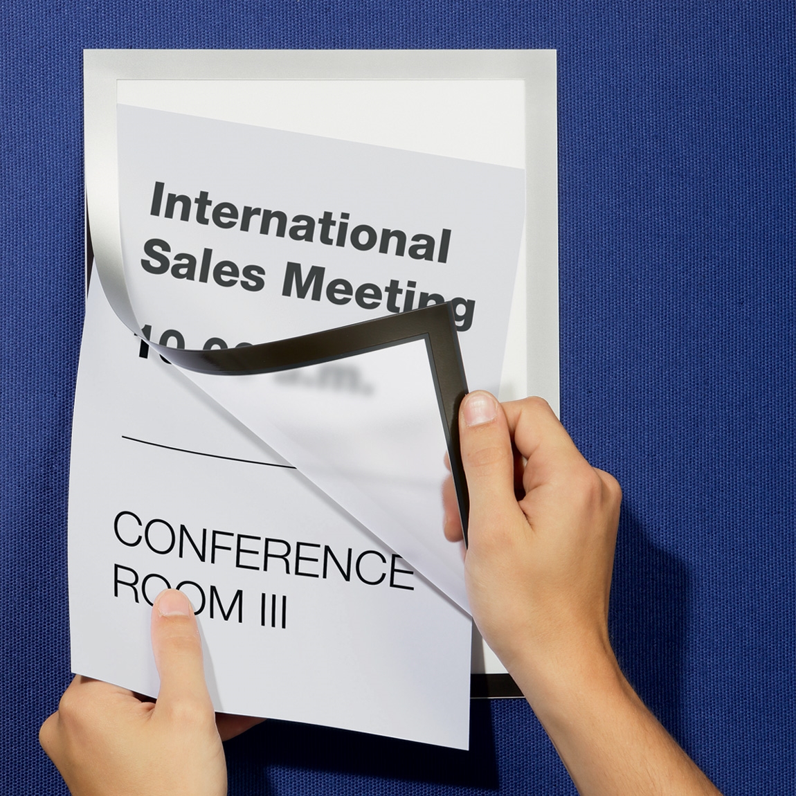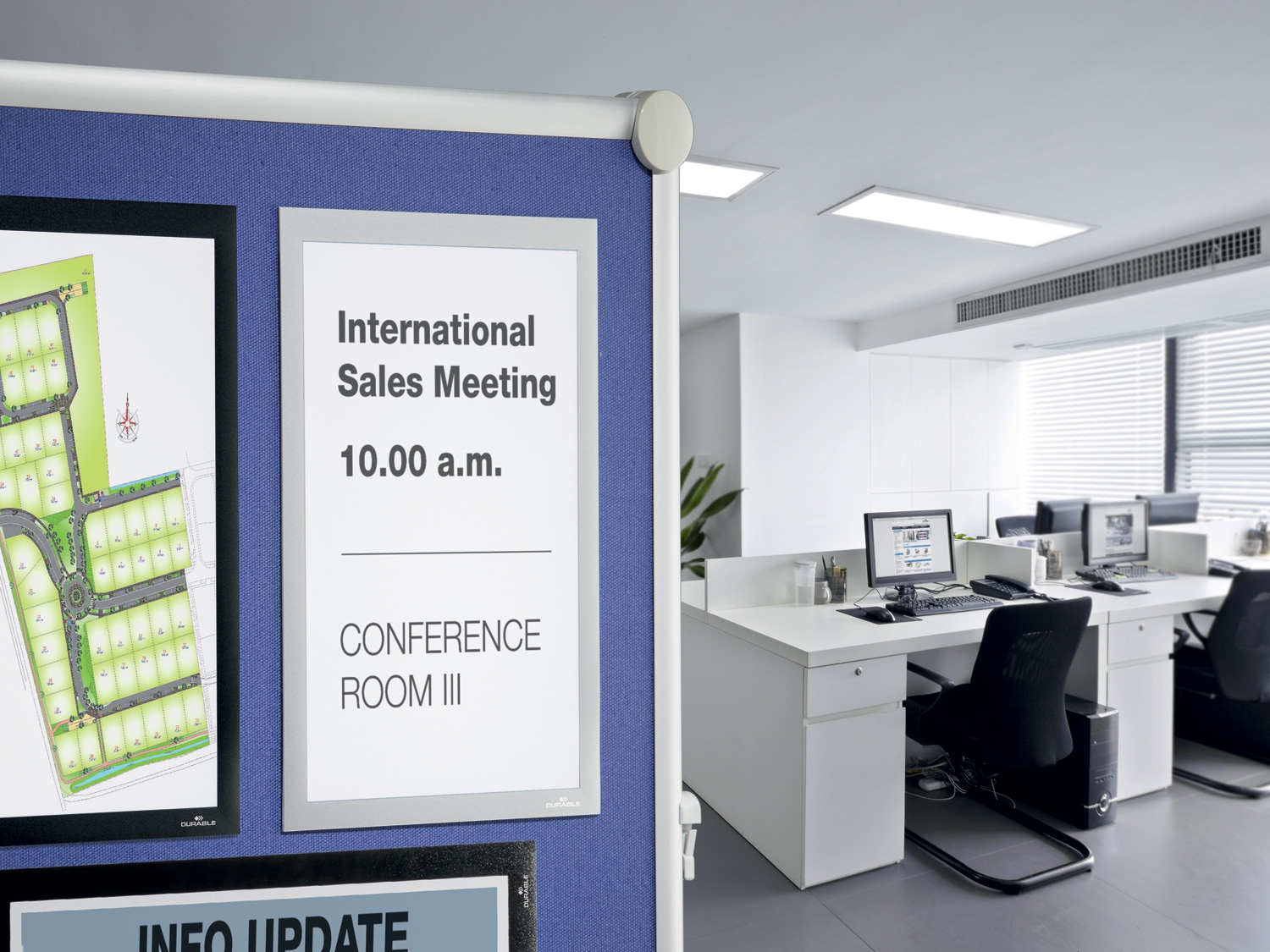 DURAFRAME®️ GRIP sølv inforamme fra Durable er den ideelle løsningen for display av informasjoner og opplysninger på tekstiloverflater.
