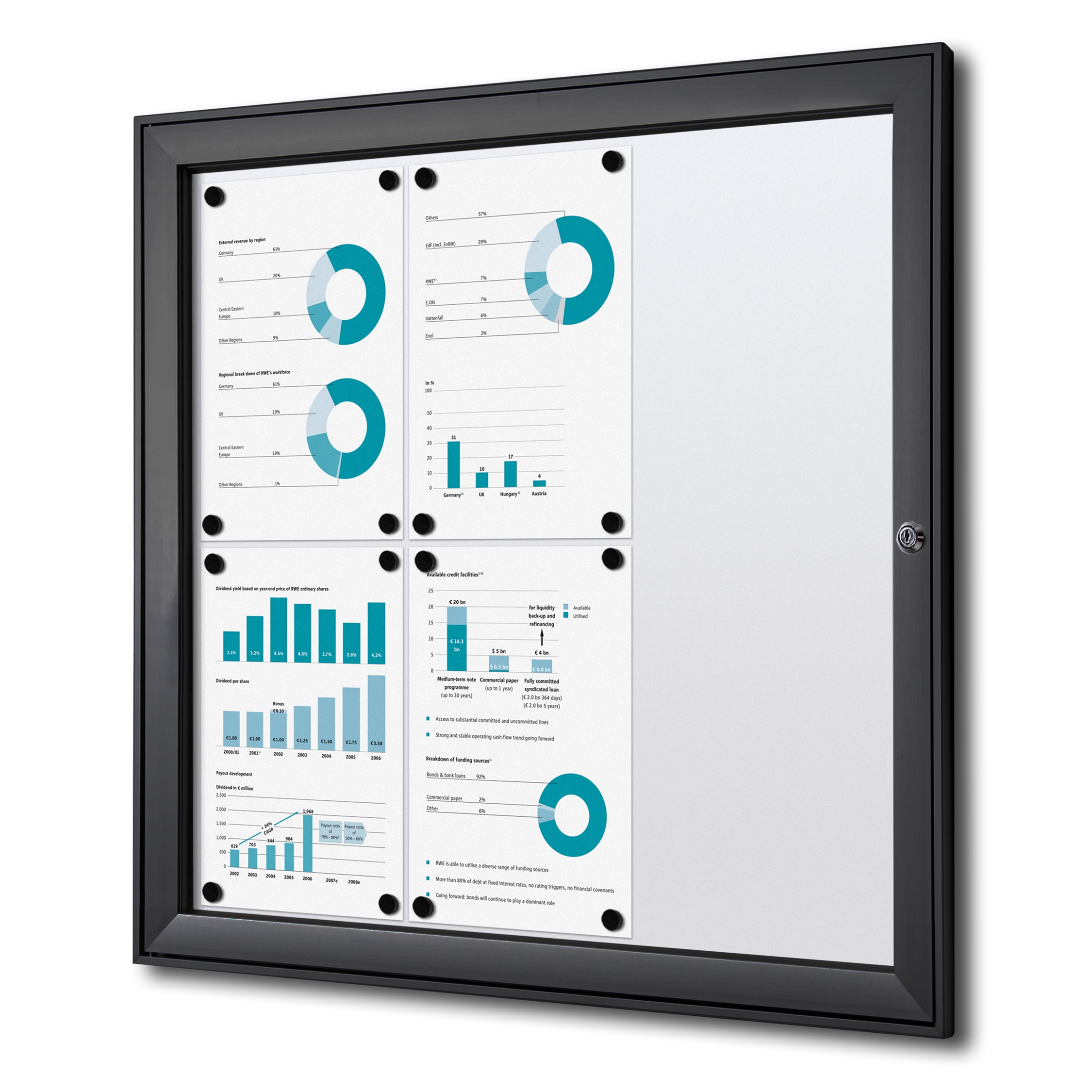Eksklusiv oppslagsskap i svarteloxeret aluminium med lakkert stål bakplate (whiteboard) og låsbar dør.