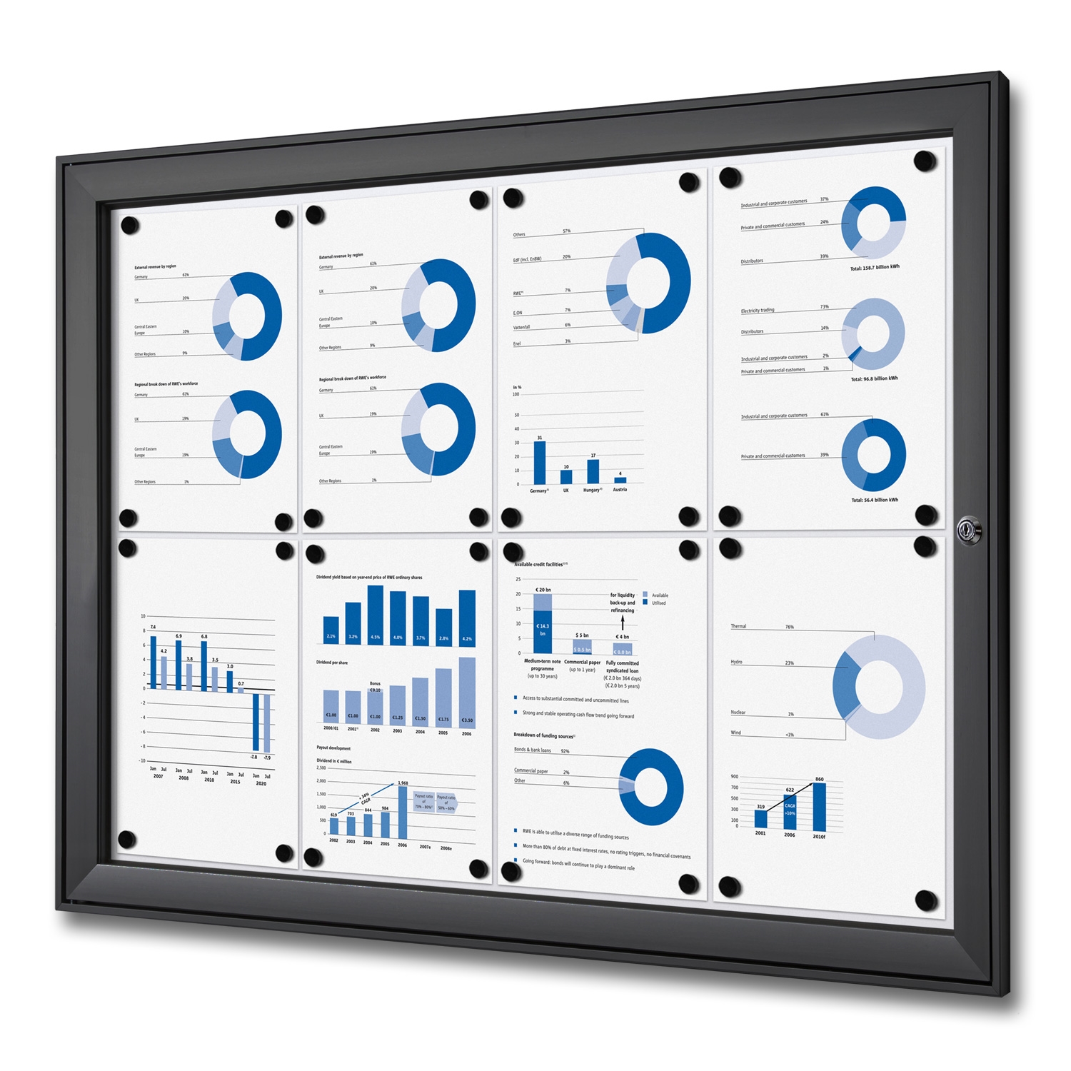 Eksklusiv oppslagsskap i svarteloxeret aluminium med lakkert stål bakplate (whiteboard) og låsbar dør.