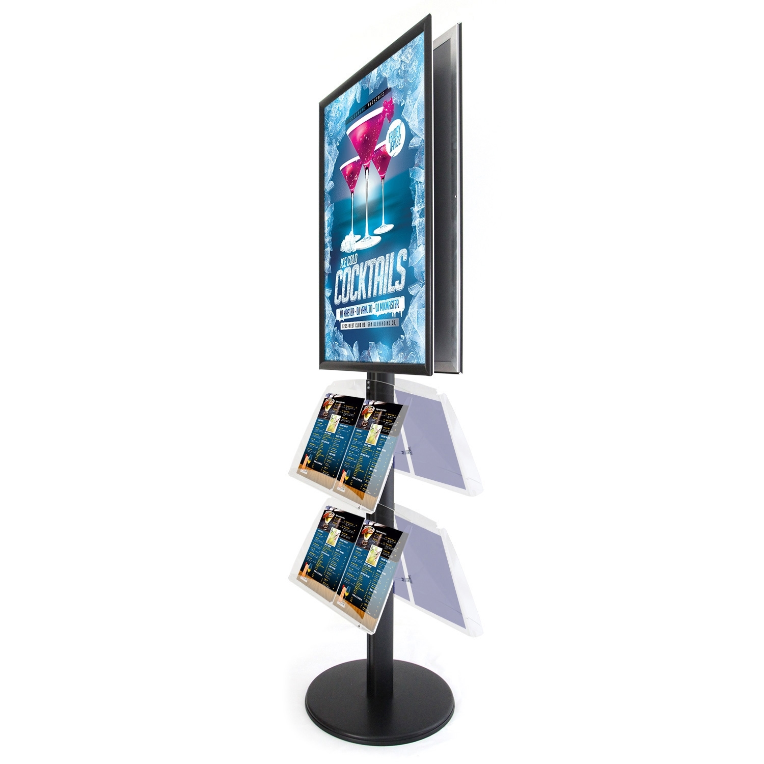 Dobbelsidige infostand med eksklusiv matt svart finish og esktra tung fot for stabilitet.