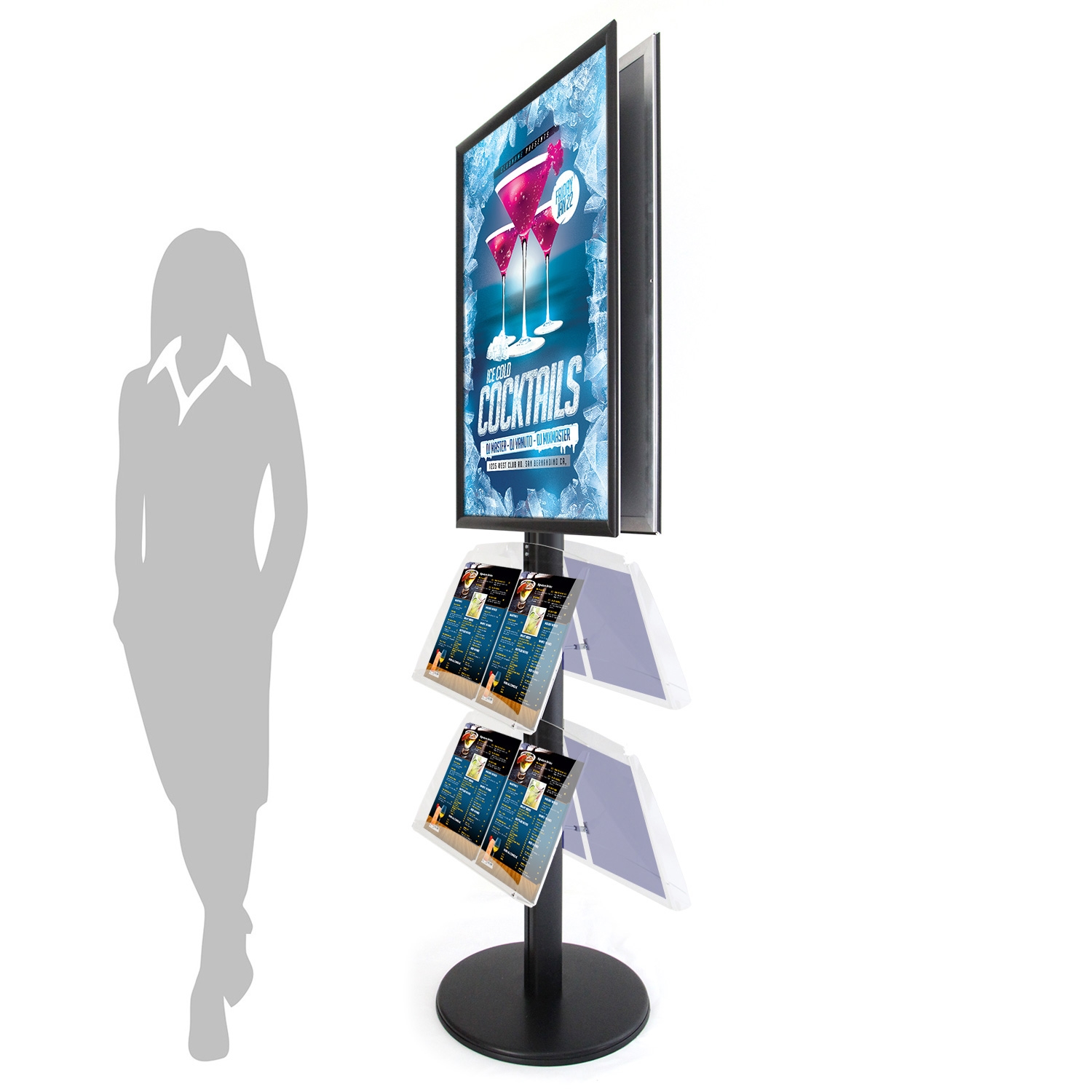 Dobbelsidige infostand med eksklusiv matt svart finish og esktra tung fot for stabilitet.