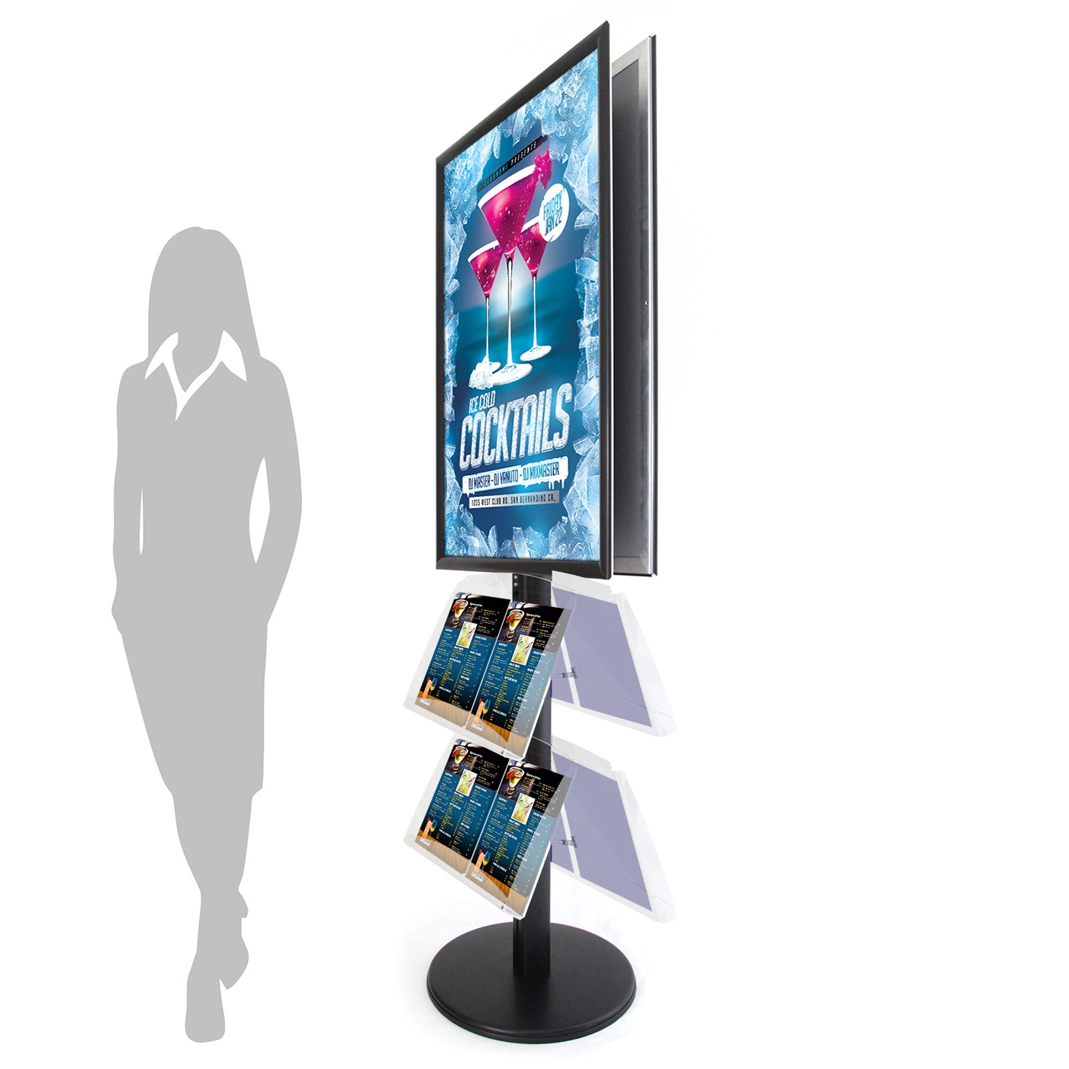 Dobbelsidige infostand med eksklusiv matt svart finish og esktra tung fot for stabilitet.