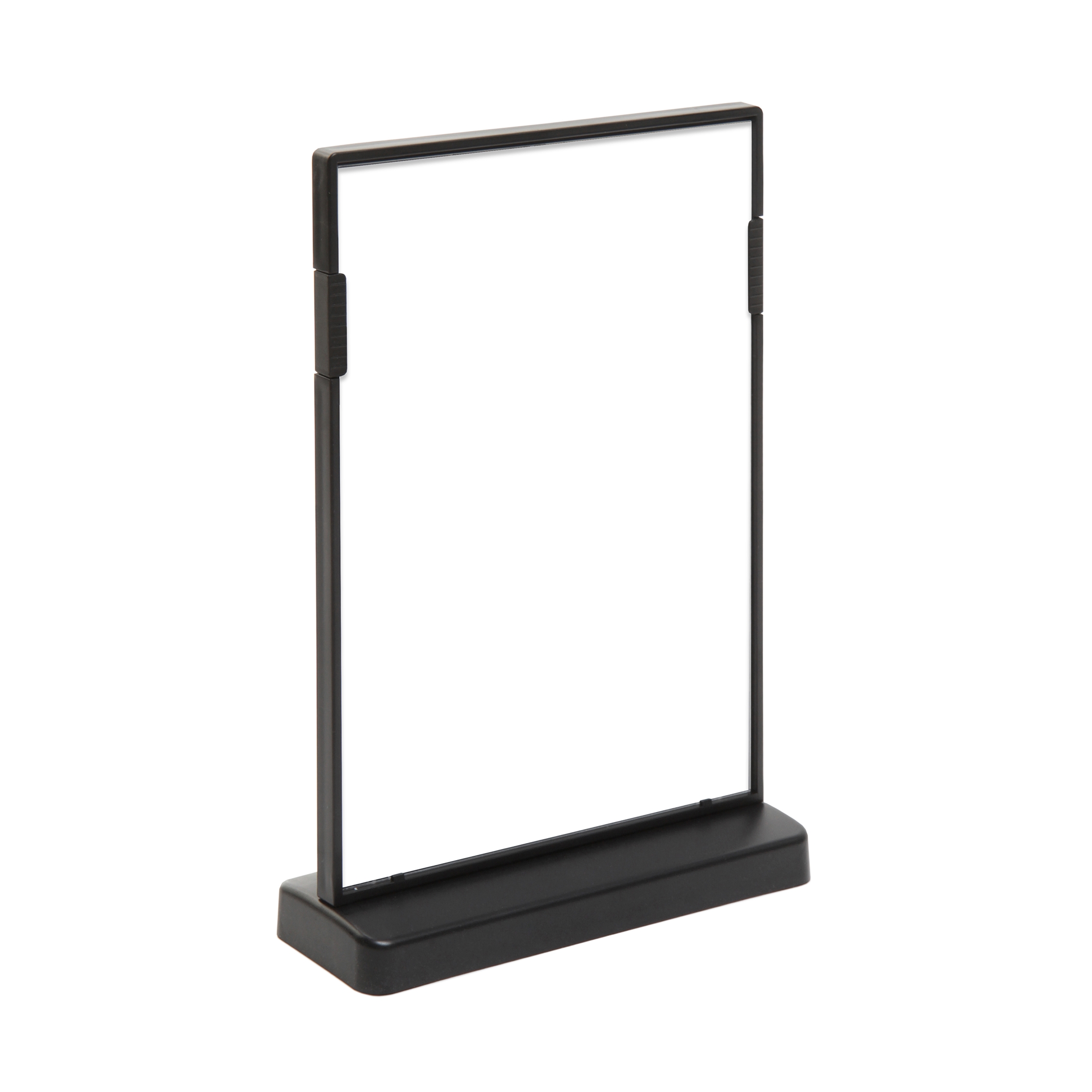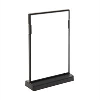 Sort dobbeltsidig T-stativ menyholder i stående format med smart klipssystem, laget av svart, slitesterk polypropylenplast. Garantert stabilitet med slitesterk base. Dobbeltsidig presentasjon for å sette inn og enkelt bytte A5- og A6-ark.