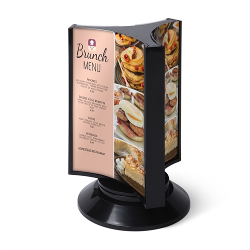 Elegant og praktisk tresidig menykortholder med 360° rotasjon.