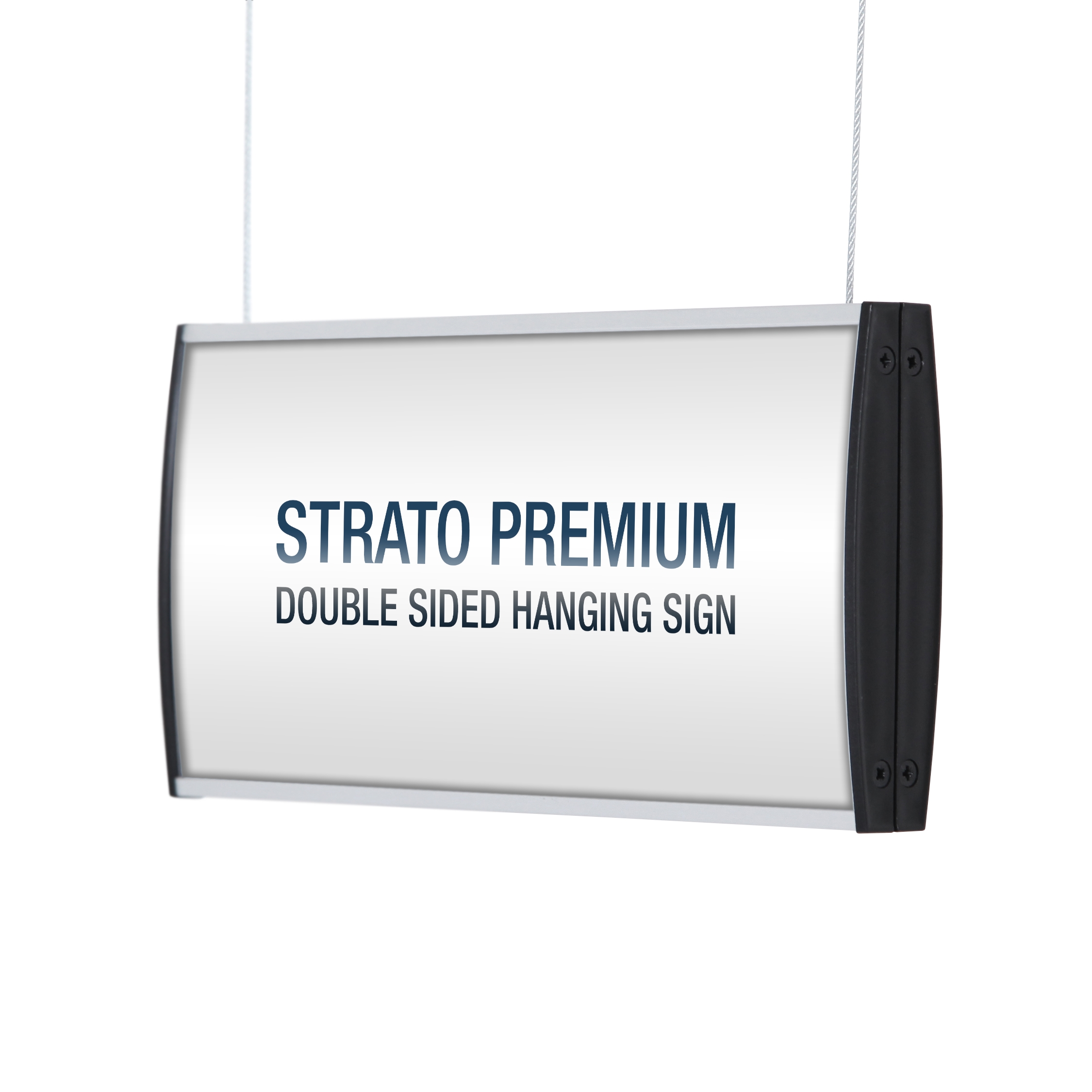 Dobbelsidig nedhengsskilt med avtagelige anti-refleks frontplater, til takmontering med wire og beslag.
