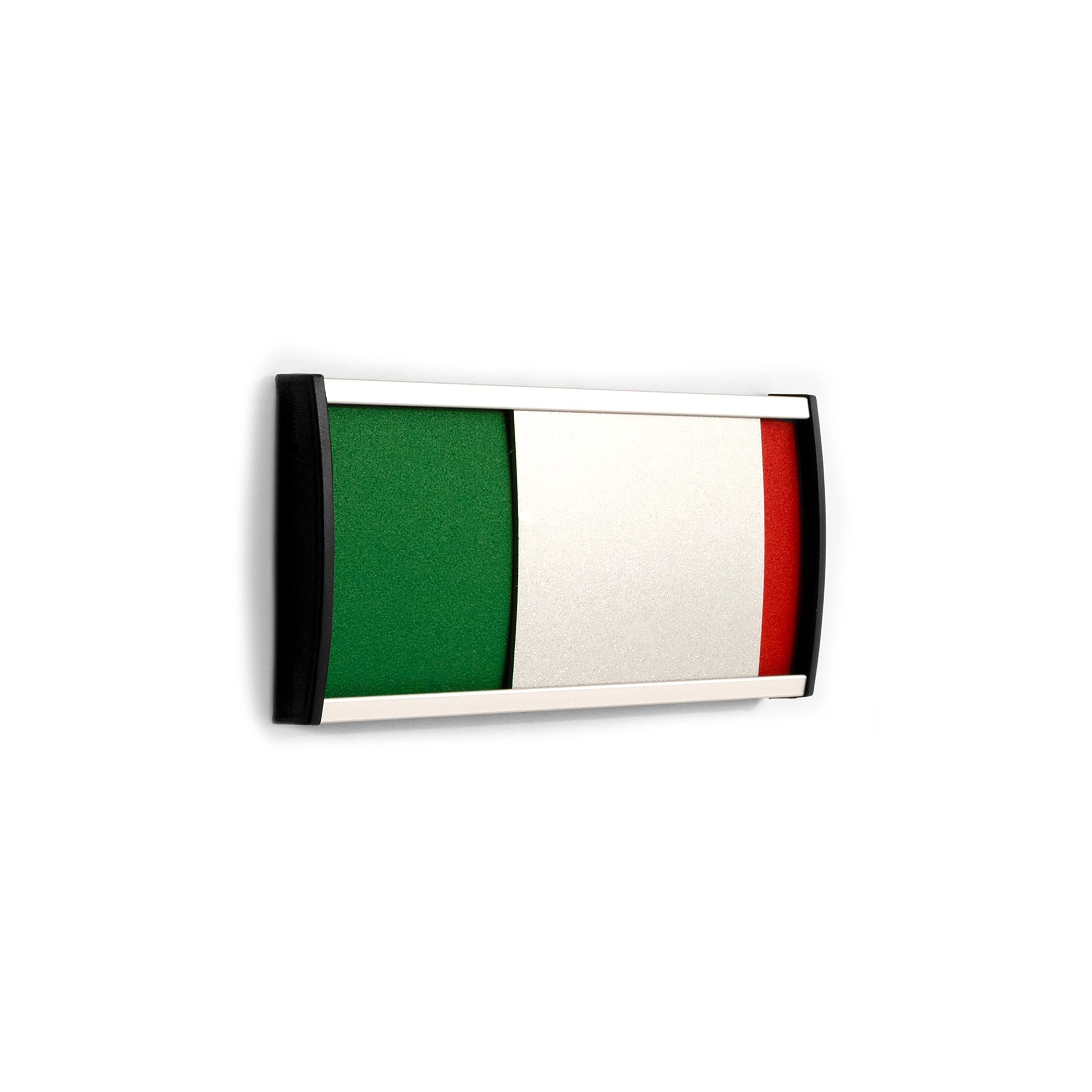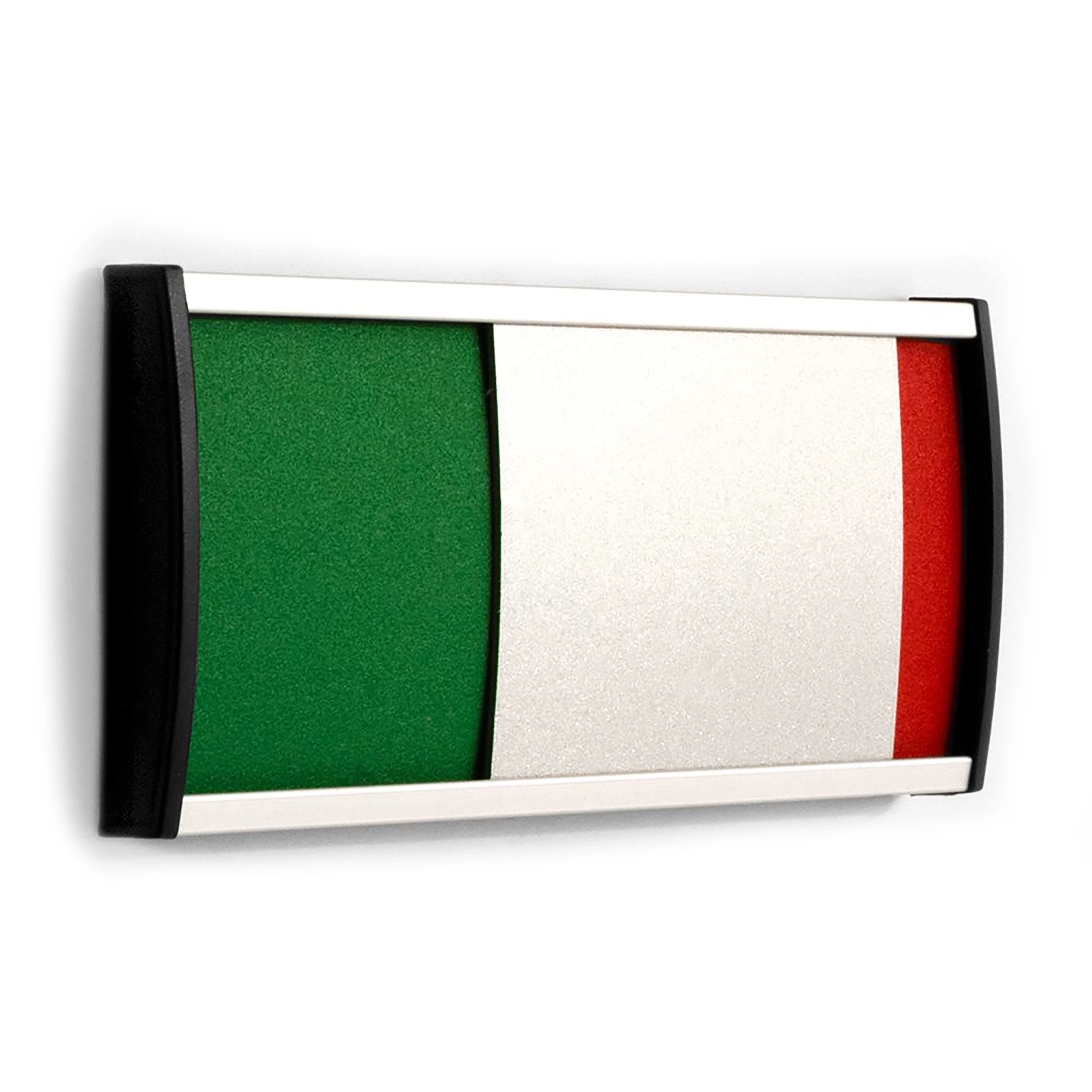 Eksklusivt arkitekttegnet kontorskilt i et elegant, buet design. Skiltet måler 56x150mm og er laget i sølv-anodisert aluminium med sorte endestykker. Det har en rød/grønn bakgrunn og en sølvfarget skyveknapp som tydelig viser status.
