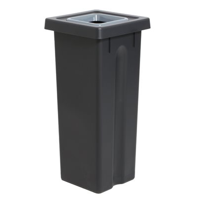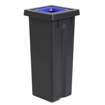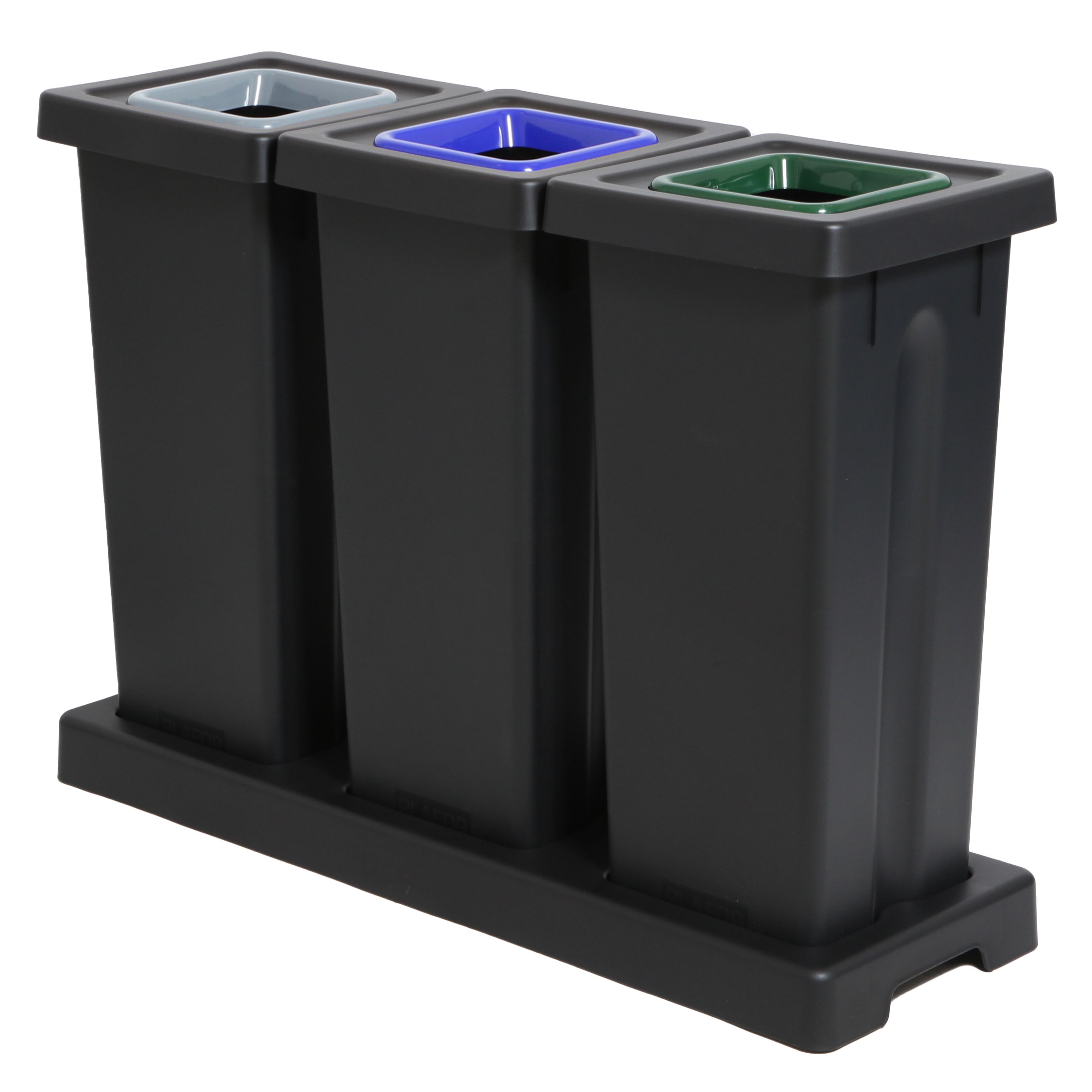 Dette sorteringssystem i svart, kraftig, 100% gjenbrukt plastik med en kapasitet på 3x53L og med lokk i blå, grå og grønn.