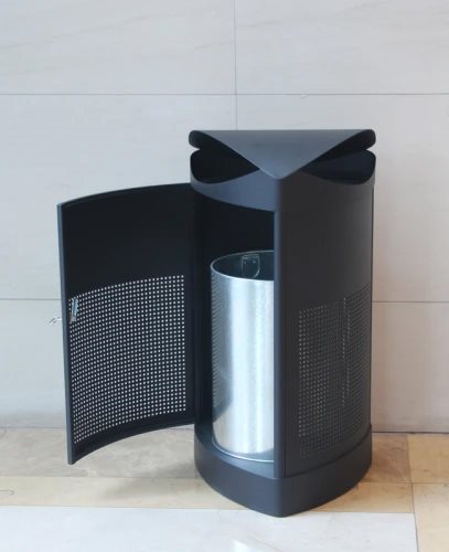 Stilren og robust 60 liter utendørs søppelbøtte med innkast fra to sider. Produsert i pulverlakkert stål og med topp som beskytter avfallet mot regn og fugle. Søppelbøtten har en innbygget dør til tømming, nøkler følger med.