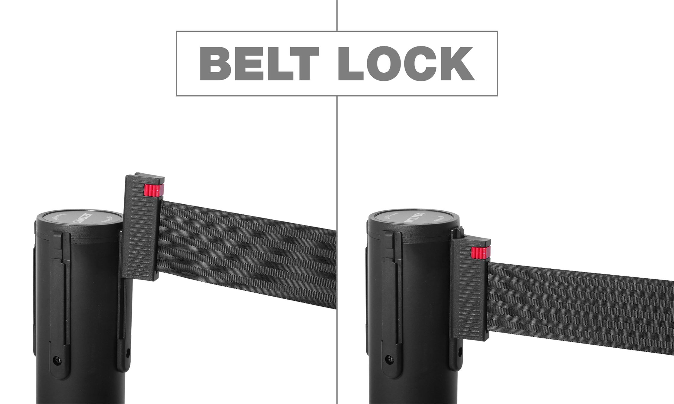 Båndene er utstyrt med en lås, som sikrer, at de sitter godt og fast på andre stolper. Skiltex avsperringsstolper har en universell bånd-lås, som passer til andre populære avsperringstolpe-brands – med garanti.