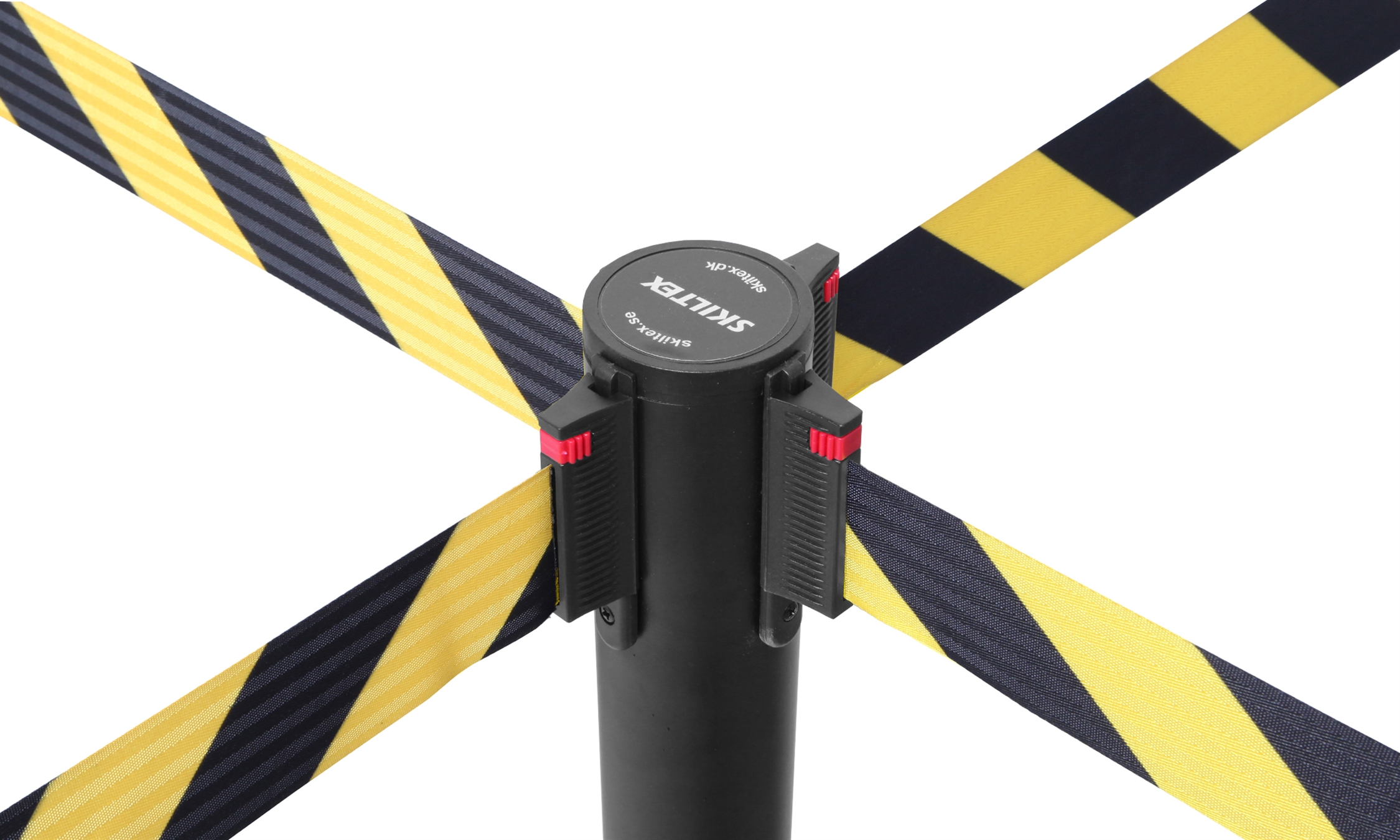 Båndene er utstyrt med en lås, som sikrer, at de sitter godt og fast på andre stolper. Skiltex avsperringsstolper har en universell bånd-lås, som passer til andre populære avsperringstolpe-brands – med garanti.