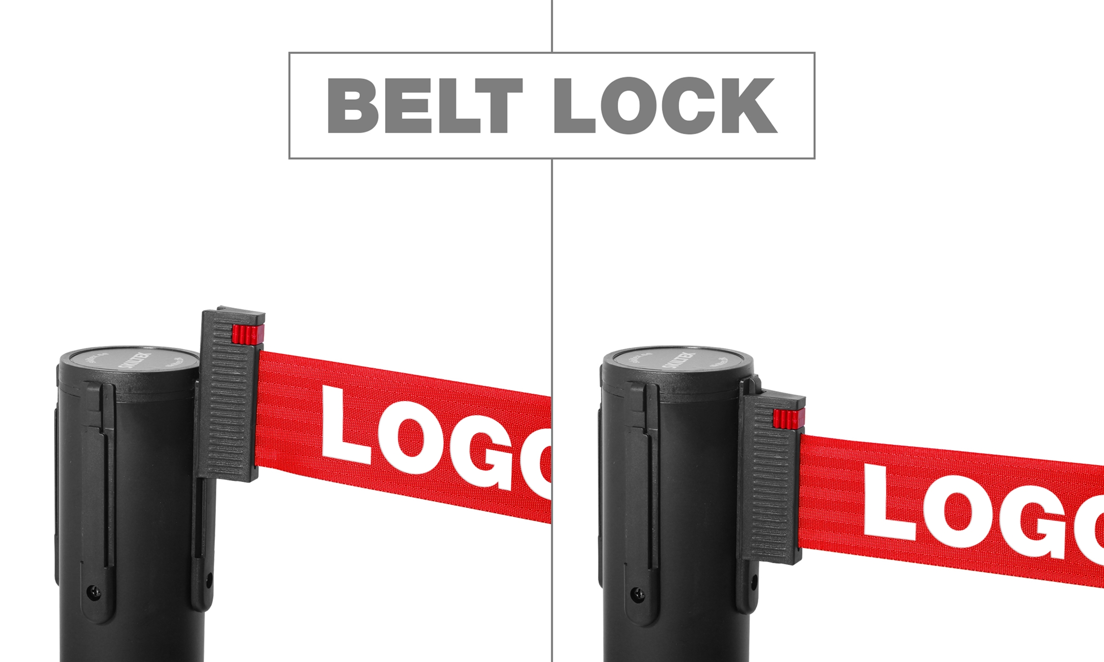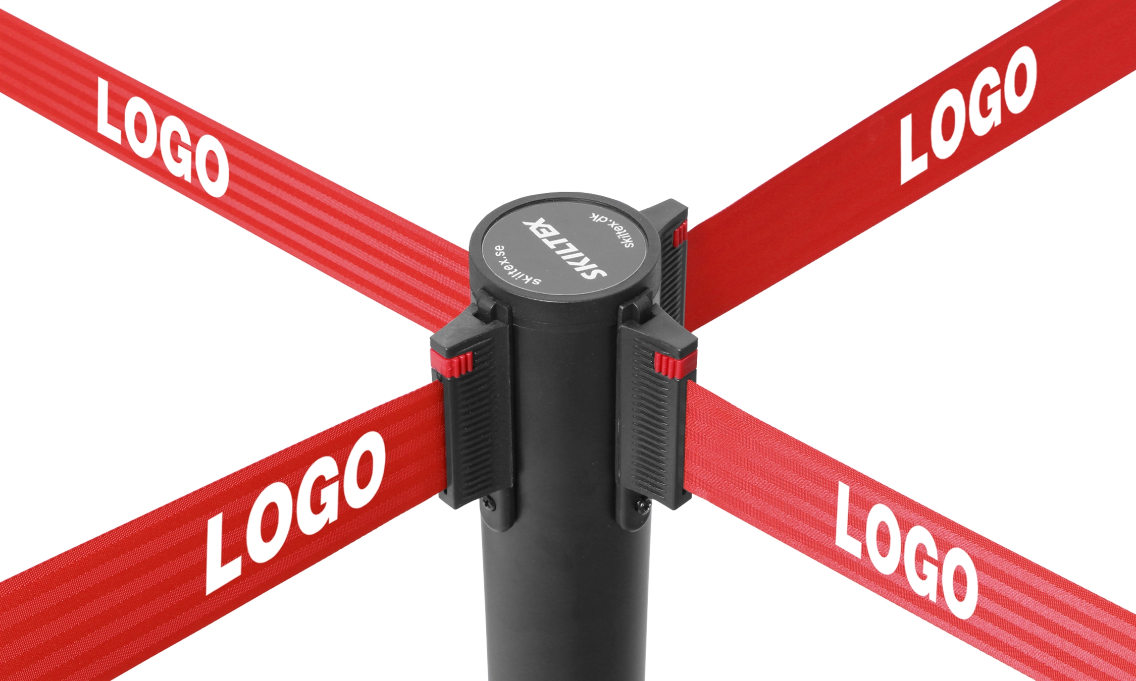 Bånden er utstyrt med en lås, som sikrer, at de sitter godt og fast på andre stolper. Skiltex avsperringsstolper har en universell bånd-lås, som passer til andre populære avsperringstolpe-brands – med garanti.
