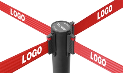 Svarte avsperringstolper med brukertilpasset trykk på begge sider av båndet.