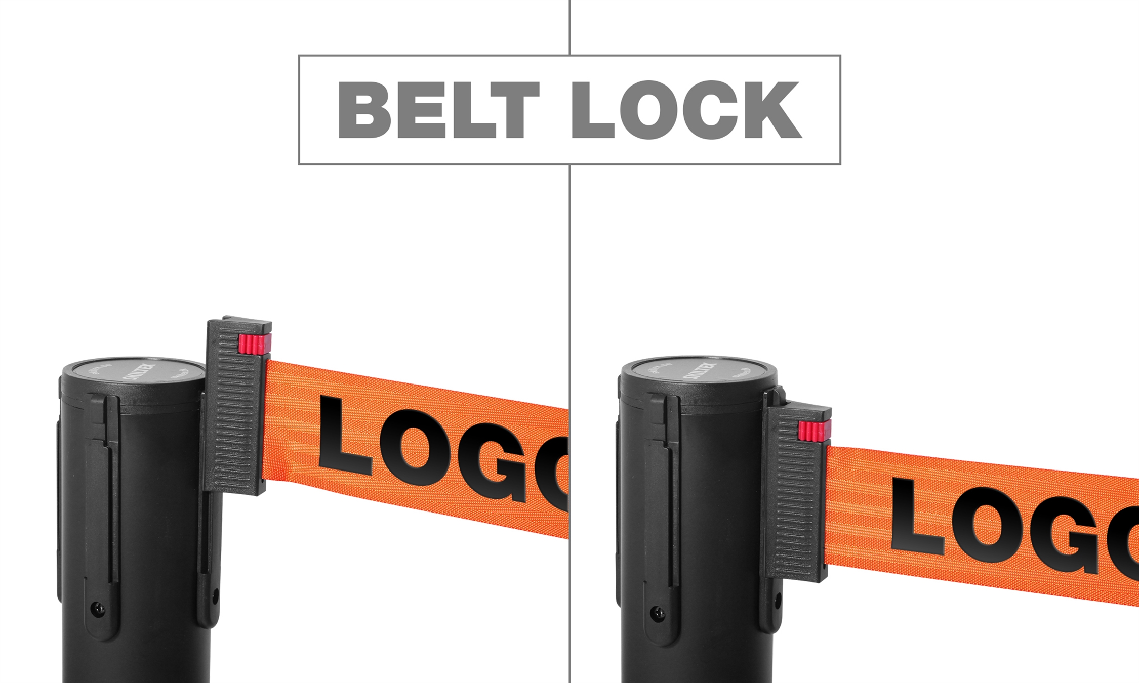 Bånden er utstyrt med en lås, som sikrer, at de sitter godt og fast på andre stolper. Skiltex avsperringsstolper har en universell bånd-lås, som passer til andre populære avsperringstolpe-brands – med garanti.