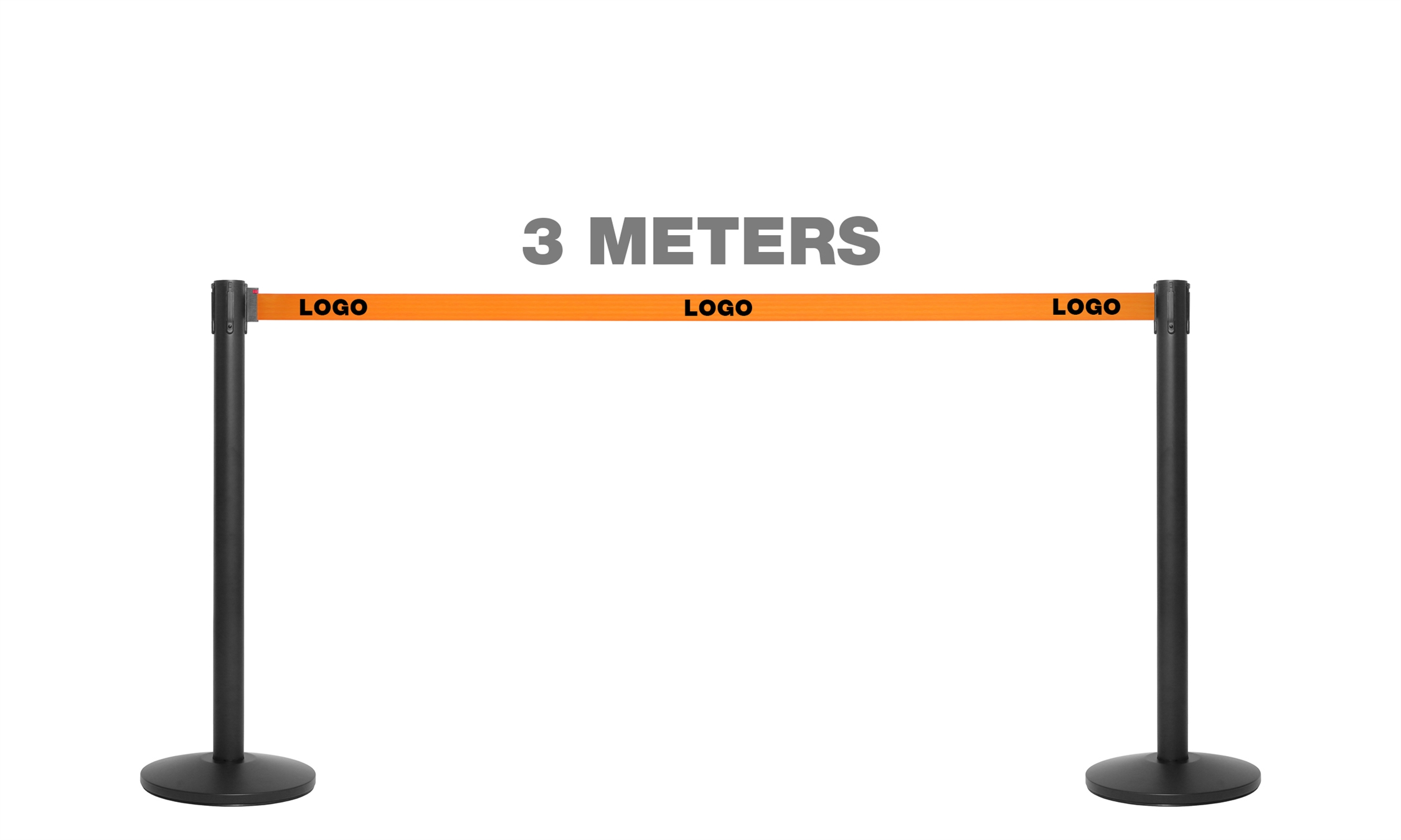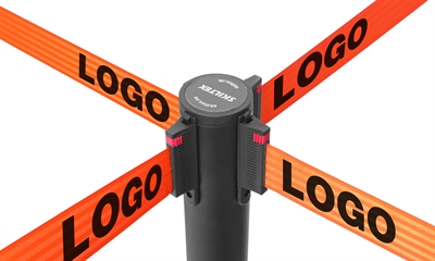 Svarte avsperringstolper med brukertilpasset trykk på begge sider av båndet.