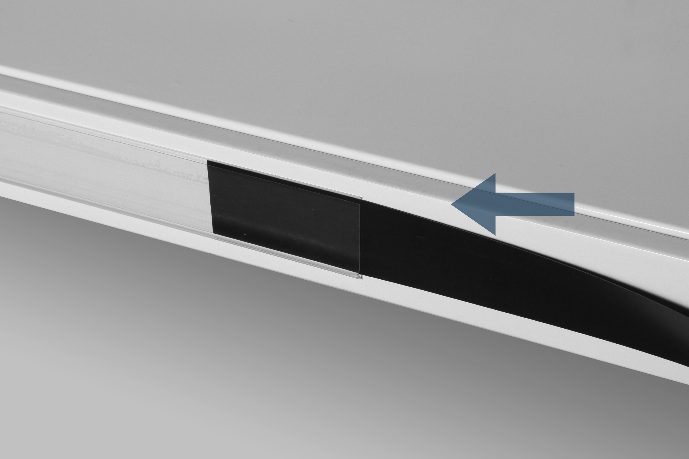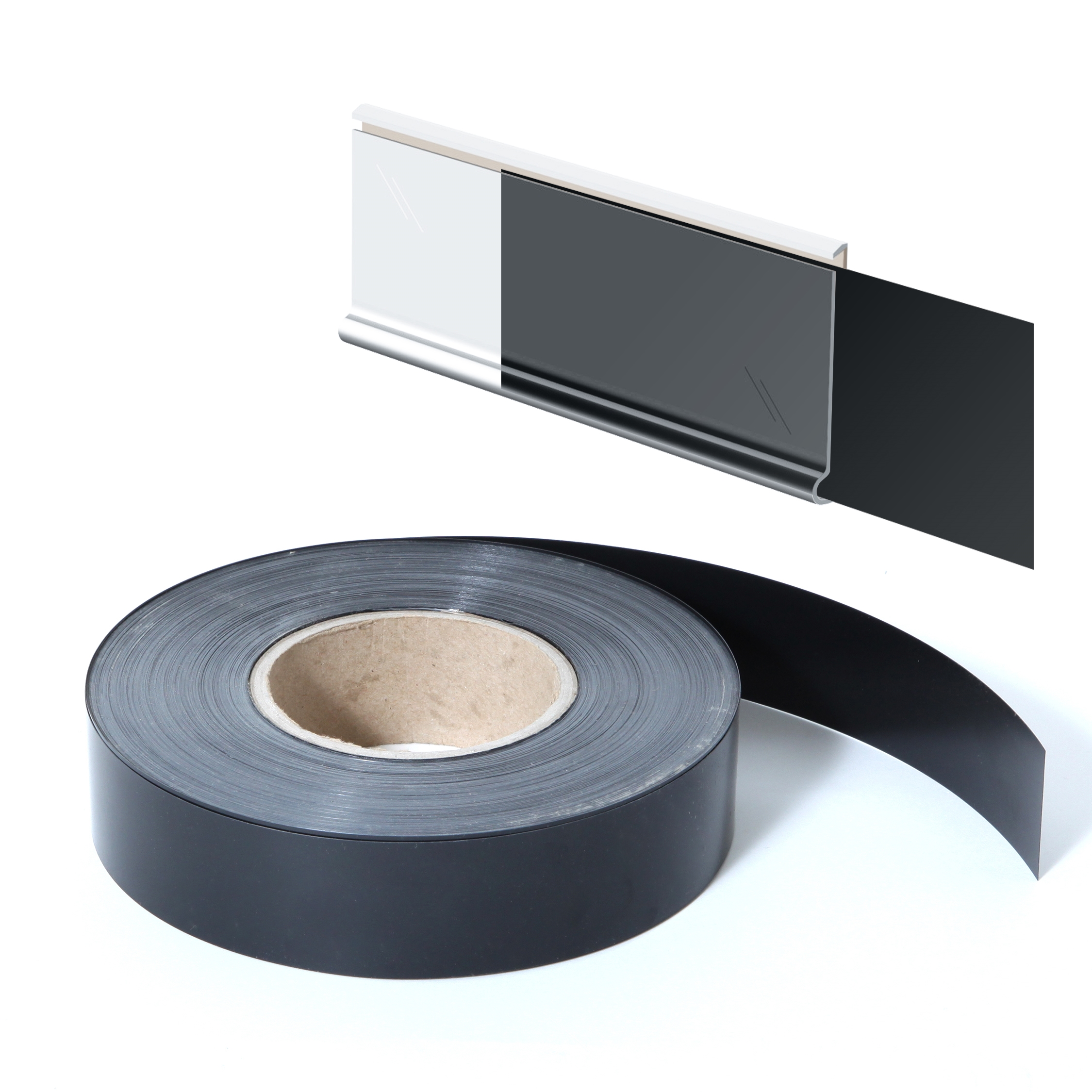 Rullen er 39 mm i høyden, og 100 meter i lengden, laget av svart plastik som er lett at klippe til, og sette i siden på hylleforkanter.