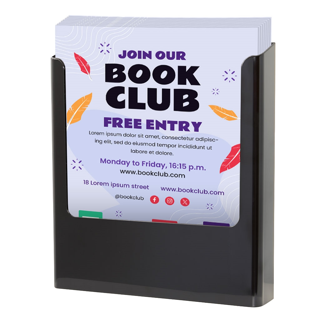 Stilrent svart brosjyreholder produsert i polystyren til montering på vegg.