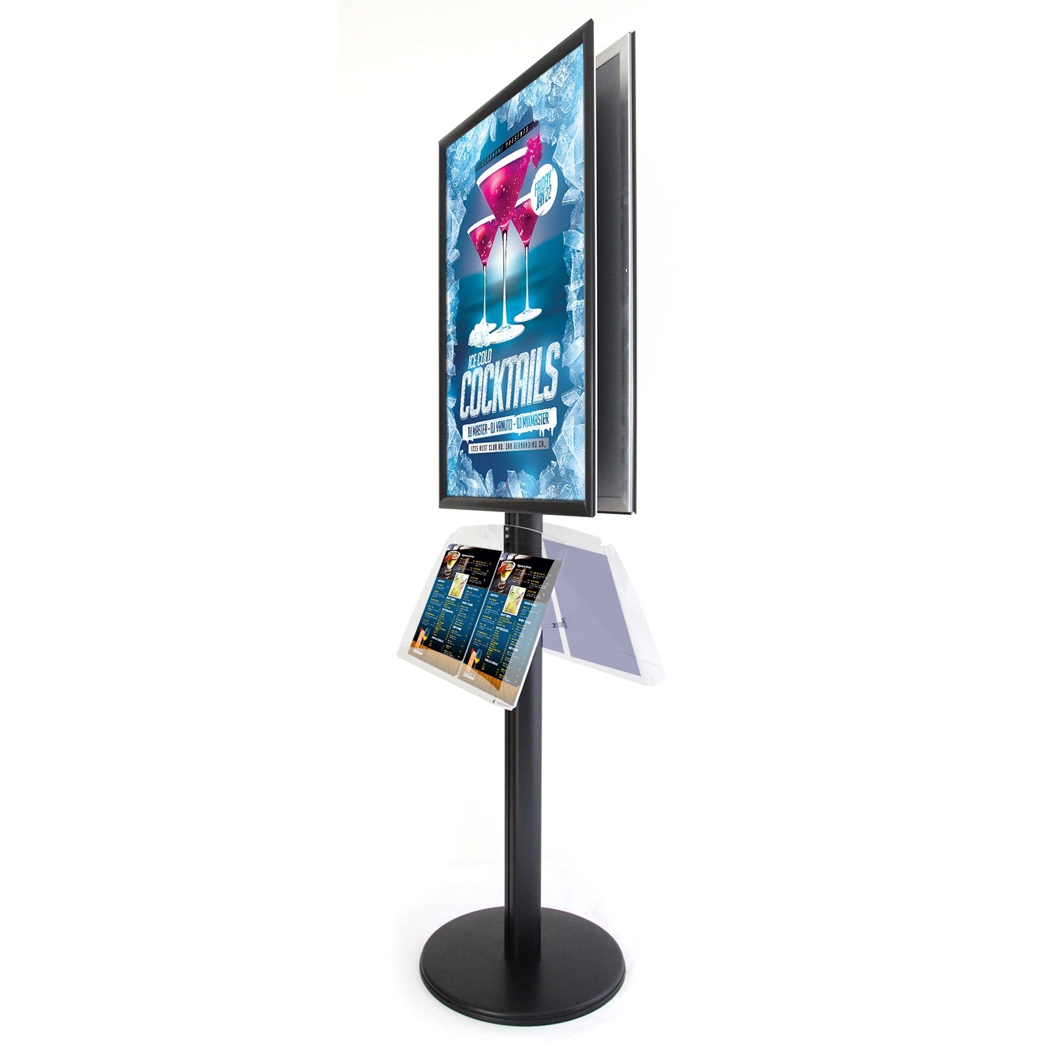 Luksus dobbelsidige plakatstativer av aluminium med eksklusiv matt svart finish og ekstra tung fot for stabilitet.
