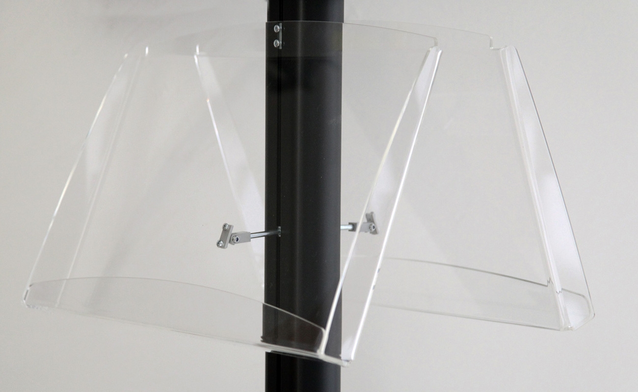 ProStanden er montert med 8 akrylhyller - 4 på hver side. Hver hylle kan holde 2 stk stående A4 eller 1 stk liggende A3.