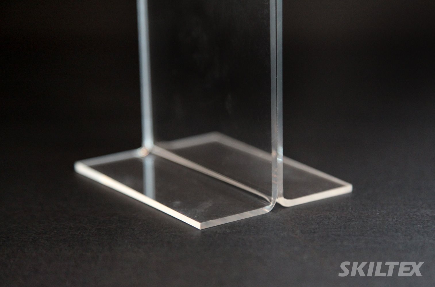 Disse frittstående akrylskiltene er omvendt T-formede og egner seg for både enkelt- og dobbeltsidig bruk, da skiltene står horisontalt.
