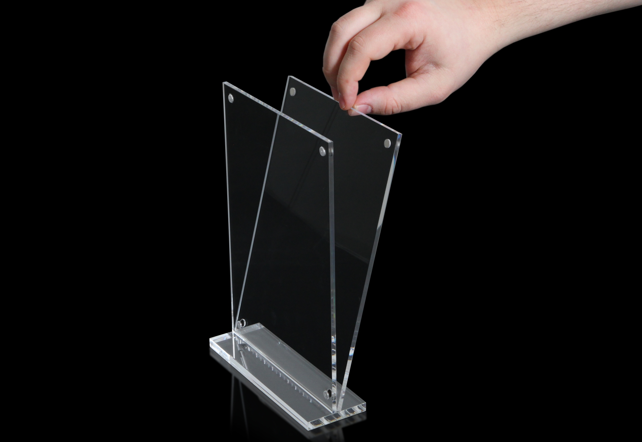 De 2 akrylblokkene er forbundet med sterke magneter, slik at du alltid kan være sikker på at innholdet er godt beskyttet, men samtidig kan det også skiftes enkelt og raskt. Kan brukes både vertikalt og horisontalt.