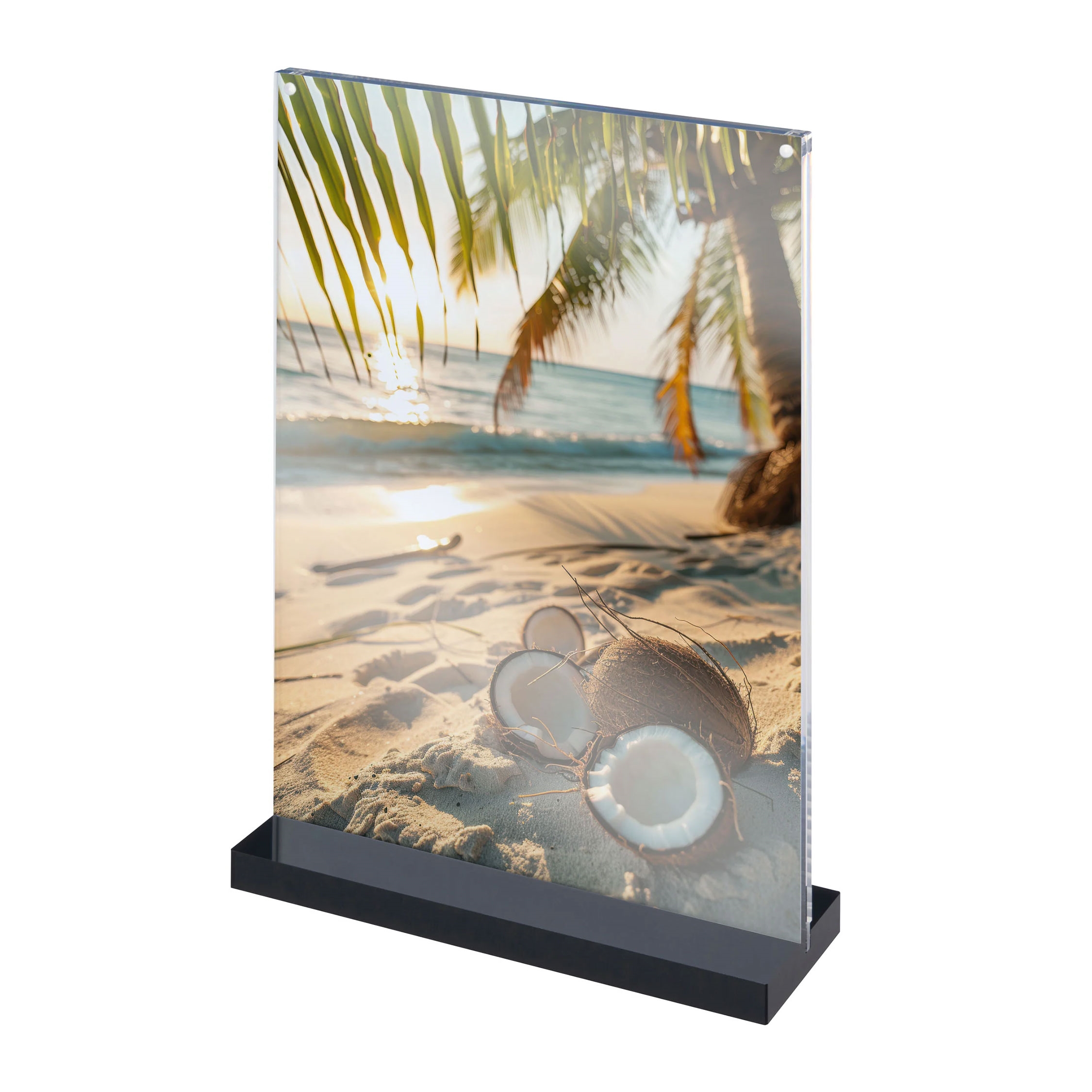 Magnetisk transparent T-formet skiltholder av krystallklar akryl med sort base - perfekt for eksklusiv presentasjon av menyer, prislister eller som en stilren fotoramme.