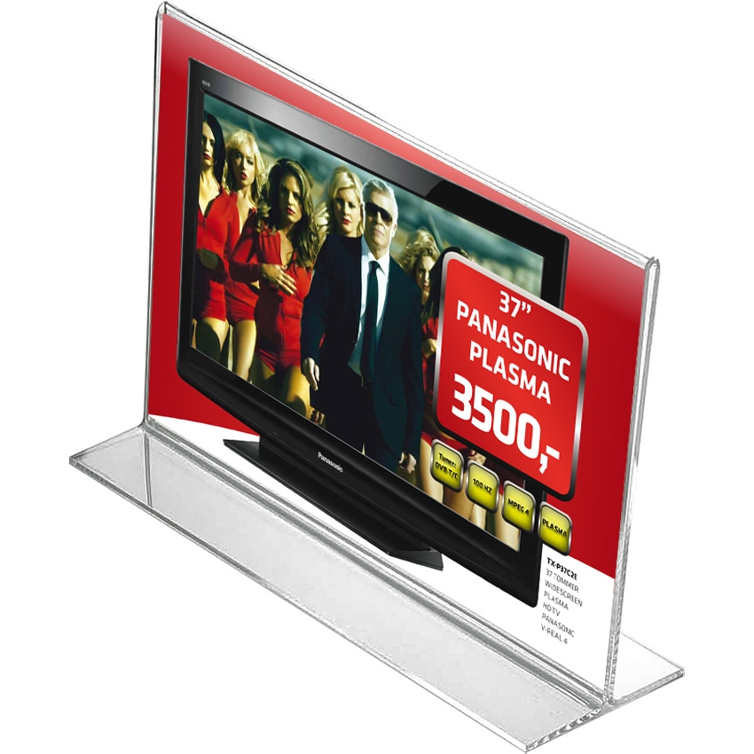 Vi har bredformat T-stand akrylholdere i 7 forskjellige størrelser, som alle er laget av krystallklar akryl og står meget stabilt.