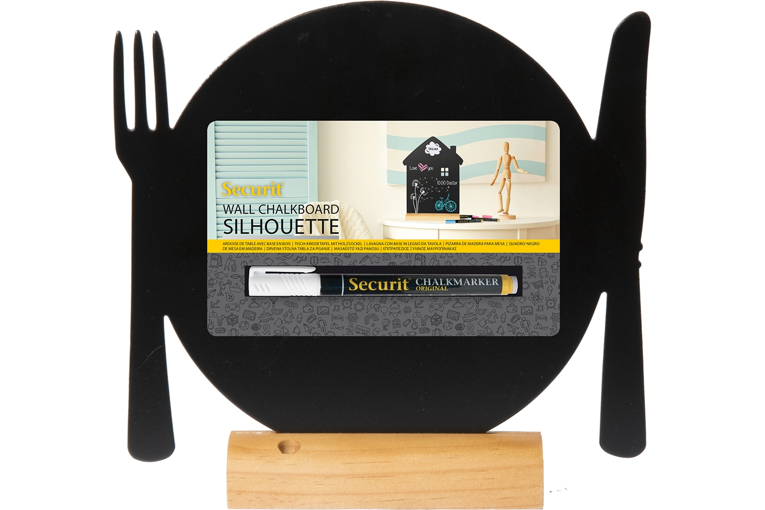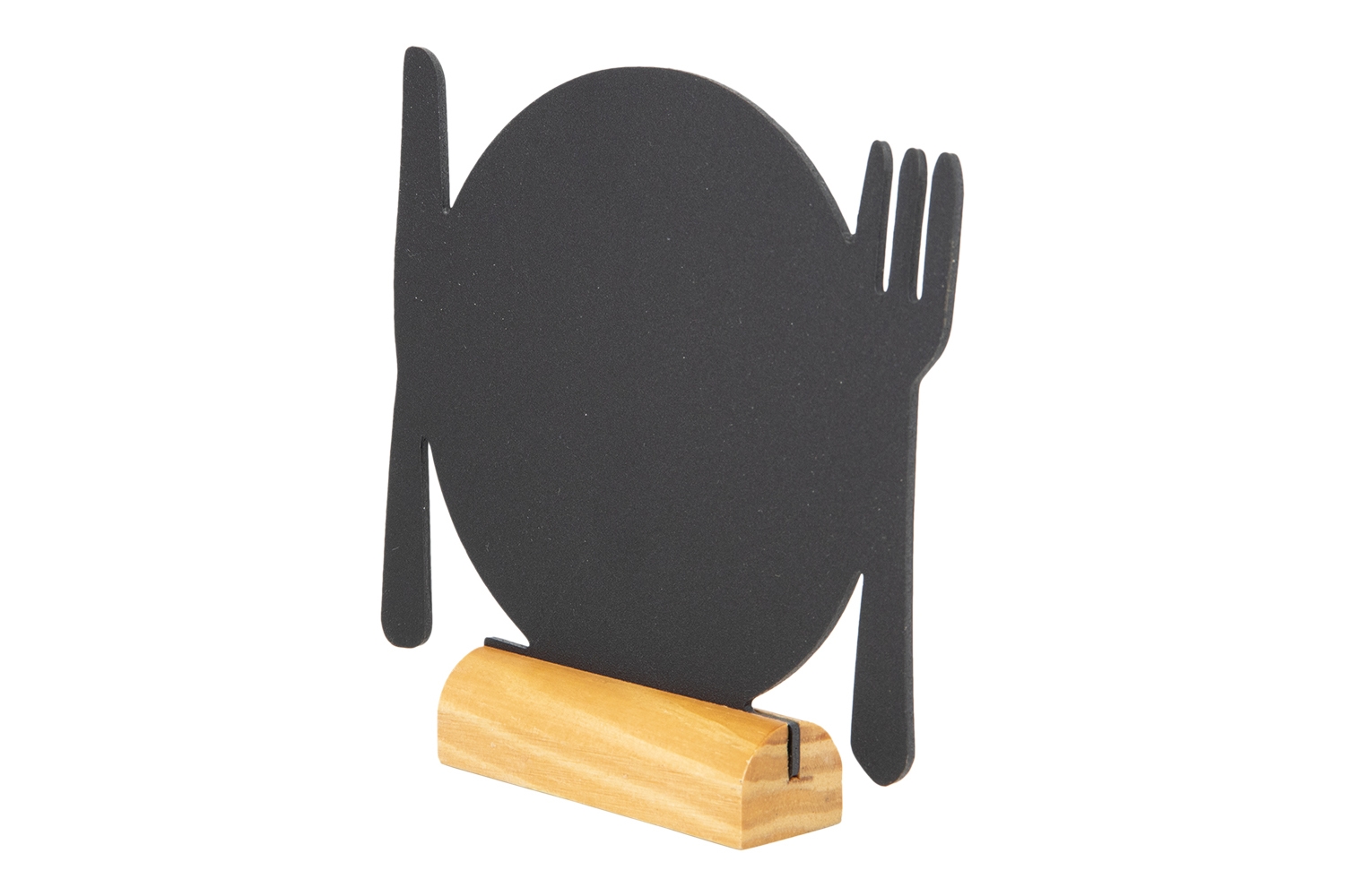 Dobbelsidig tallerken Silhouette tavleskilt til bord, med flot fot i teaktre. Foten kommer med en holder til den inkluderte hvite kritt marker penn som har en på skrivebredde 1 og 2 mm. Silhuetten kan tas opp av foten, og flyttes over til annen av samme type.